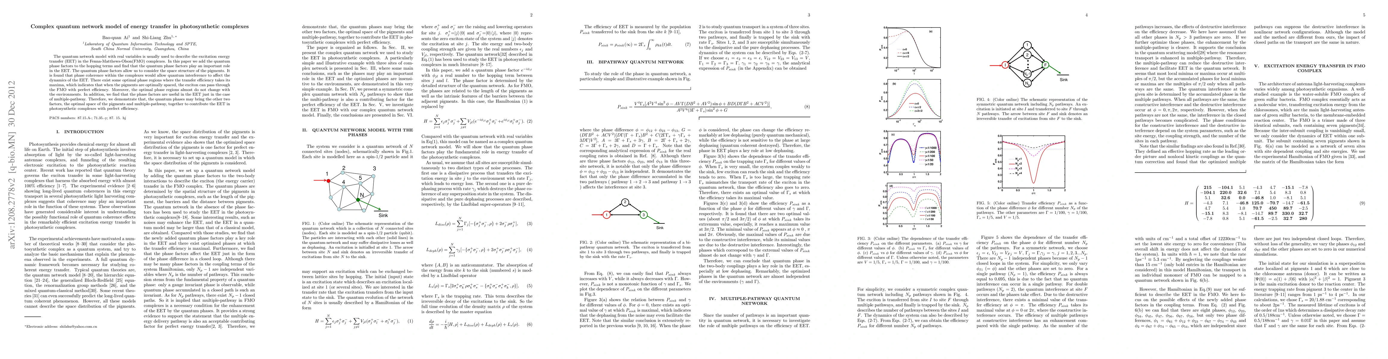 This paper introduces a quantum network model that incorporates quantum phase factors in energy transfer processes within FMO complexes. The study reveals that phase coherence enhances energy transfer efficiency, especially in optimal pigment spacing and multiple-pathway scenarios, suggesting quantum phases play a crucial role in perfect energy transfer.