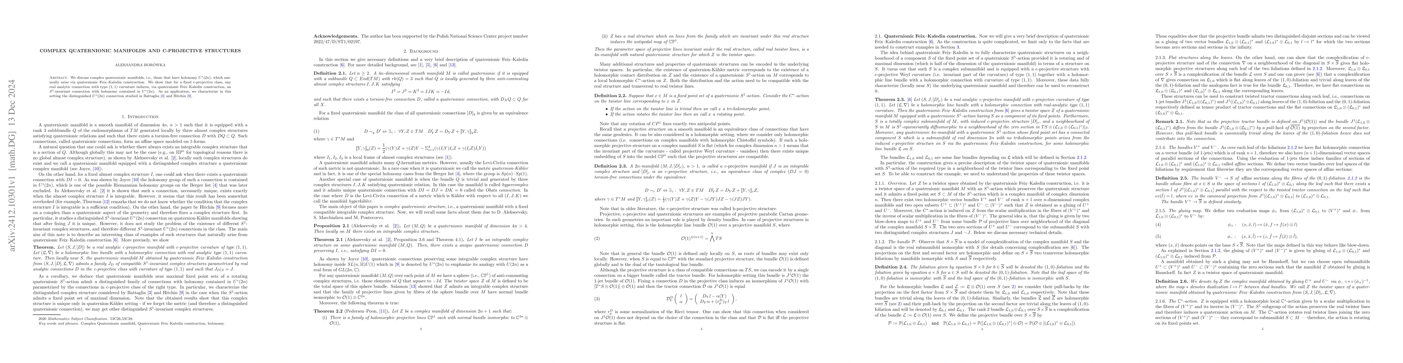 We discuss complex quaternionic manifolds, i.e., those that have holonomy $U^*(2n)$, which naturally arise via quaternionic Feix--Kaledin construction. We show that for a fixed c-projective class, any real analytic connection with type $(1,1)$ curvature induce, via quaternionic Feix--Kaledin construction an $S^1$-invariant connection with holonomy contained in $U^*(2n)$. As an application we characterize the distinguished $U^*(2n)$ connection studied in \cite{Bat} and \cite{Hit3} in this setting.