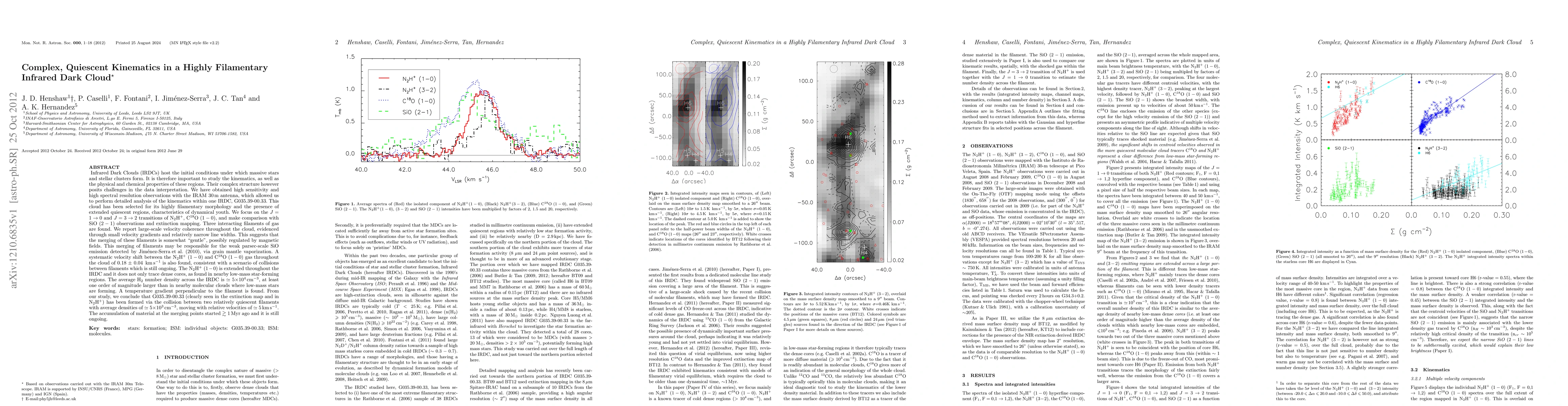 Infrared Dark Clouds (IRDCs) host the initial conditions under which massive stars and stellar clusters form. We have obtained high sensitivity and high spectral resolution observations with the IRAM 30m antenna, which allowed us to perform detailed analysis of the kinematics within one IRDC, G035.39-00.33. We focus on the 1-0 and 3-2 transitions of N2H+, C18O (1-0), and make comparison with SiO (2-1) observations and extinction mapping. Three interacting filaments of gas are found. We report large-scale velocity coherence throughout the cloud, evidenced through small velocity gradients and relatively narrow line widths. This suggests that the merging of these filaments is somewhat "gentle", possibly regulated by magnetic fields. This merging of filaments may be responsible for the weak parsec-scale SiO emission detected by Jimenez-Serra et al. 2010, via grain mantle vaporization. A systematic velocity shift between the N2H+ (1-0) and C18O (1-0) gas throughout the cloud of 0.18 +/- 0.04 kms^{-1} is also found, consistent with a scenario of collisions between filaments which is still ongoing. The N2H+ (1-0) is extended throughout the IRDC and it does not only trace dense cores, as found in nearby low-mass star-forming regions. The average H2 number density across the IRDC is ~ 5 x 10^4 cm^{-3}, at least one order of magnitude larger than in nearby molecular clouds where low-mass stars are forming. A temperature gradient perpendicular to the filament is found. From our study, we conclude that G035.39-00.33 (clearly seen in the extinction map and in N2H+) has been formed via the collision between two relatively quiescent filaments with average densities of ~ 5 x 10^3 cm^{-3}, moving with relative velocities of ~ 5 kms^{-1}. The accumulation of material at the merging points started > 1 Myr ago and it is still ongoing.