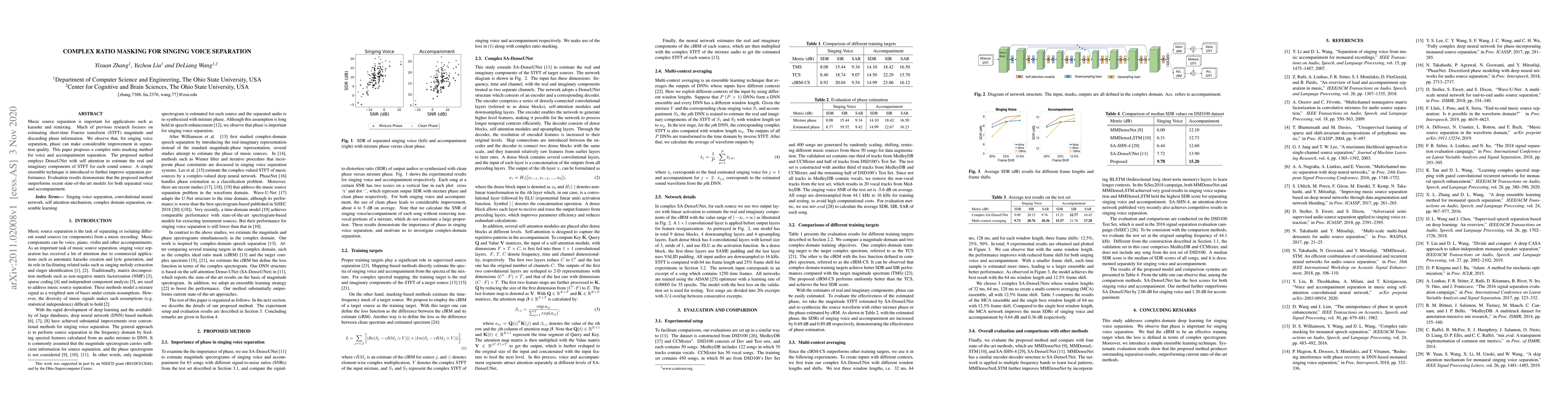 Music source separation is important for applications such as karaoke and remixing. Much of previous research focuses on estimating short-time Fourier transform (STFT) magnitude and discarding phase information. We observe that, for singing voice separation, phase can make considerable improvement in separation quality. This paper proposes a complex ratio masking method for voice and accompaniment separation. The proposed method employs DenseUNet with self attention to estimate the real and imaginary components of STFT for each sound source. A simple ensemble technique is introduced to further improve separation performance. Evaluation results demonstrate that the proposed method outperforms recent state-of-the-art models for both separated voice and accompaniment.