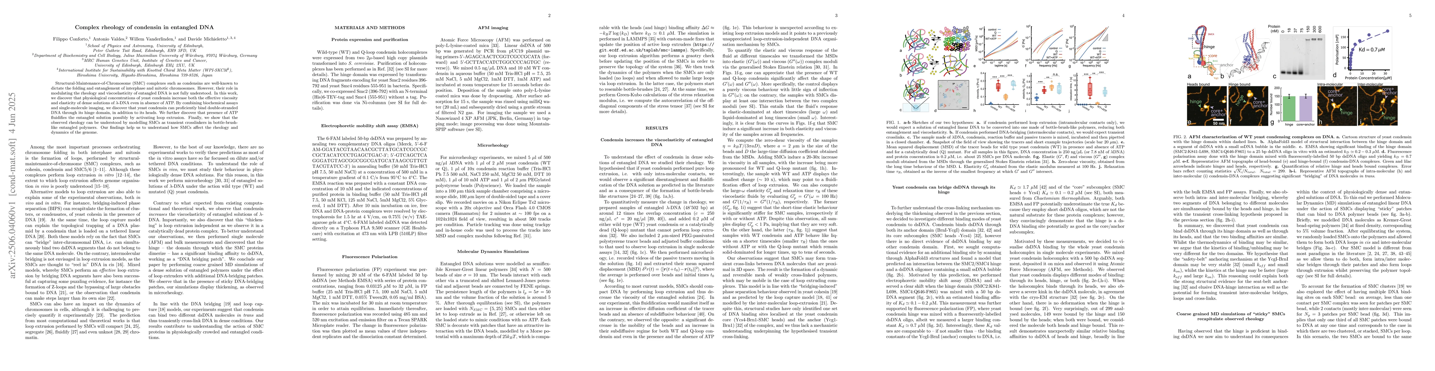 The research reveals that yeast condensin, a protein complex, enhances the viscosity and elasticity of entangled DNA even without ATP. Using biochemical and single-molecule imaging techniques, it was found that condensin binds DNA through its hinge domain, and ATP fluidifies the solution, likely via loop extrusion. The rheology is explained by modeling SMCs as transient crosslinkers in bottle-brush-like polymers, advancing understanding of genome folding and dynamics.