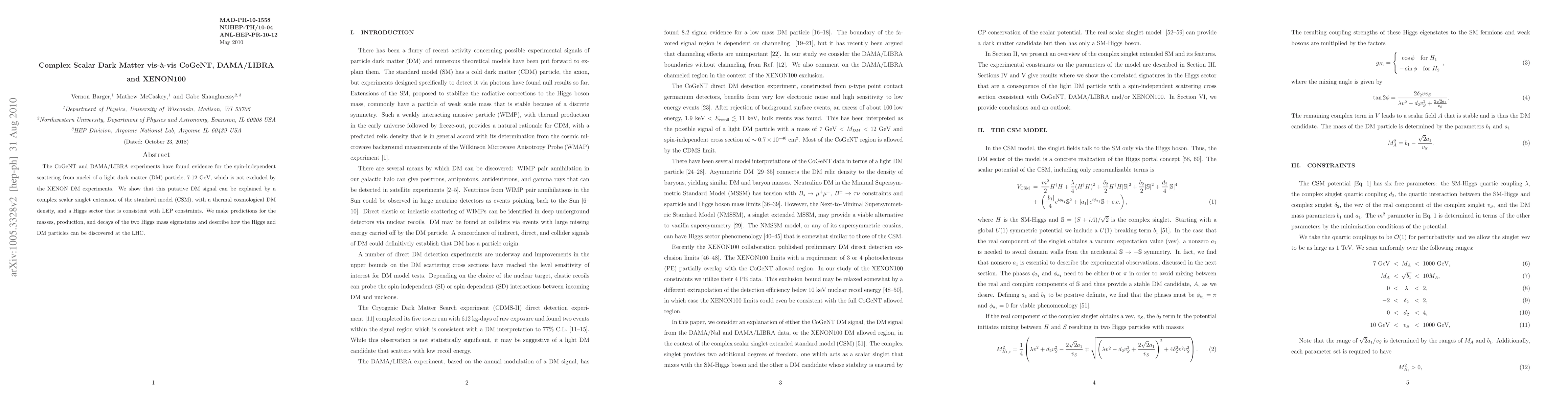 The CoGeNT and DAMA/LIBRA experiments have found evidence for the spin-independent scattering from nuclei of a light dark matter (DM) particle, 7-12 GeV, which is not excluded by the XENON DM experiments. We show that this putative DM signal can be explained by a complex scalar singlet extension of the standard model (CSM), with a thermal cosmological DM density, and a Higgs sector that is consistent with LEP constraints. We make predictions for the masses, production, and decays of the two Higgs mass eigenstates and describe how the Higgs and DM particles can be discovered at the LHC.