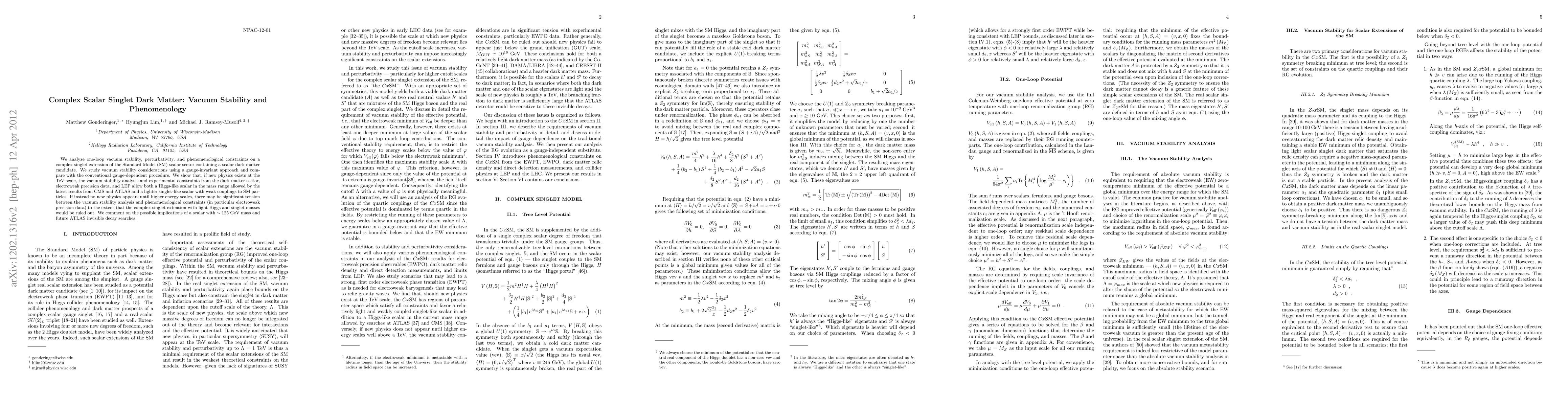 We analyze one-loop vacuum stability, perturbativity, and phenomenological constraints on a complex singlet extension of the Standard Model (SM) scalar sector containing a scalar dark matter candidate. We study vacuum stability considerations using a gauge-invariant approach and compare with the conventional gauge-dependent procedure. We show that, if new physics exists at the TeV scale, the vacuum stability analysis and experimental constraints from the dark matter sector, electroweak precision data, and LEP allow both a Higgs-like scalar in the mass range allowed by the latest results from CMS and ATLAS and a lighter singlet-like scalar with weak couplings to SM particles. If instead no new physics appears until higher energy scales, there may be significant tension between the vacuum stability analysis and phenomenological constraints (in particular electroweak precision data) to the extent that the complex singlet extension with light Higgs and singlet masses would be ruled out. We comment on the possible implications of a scalar with ~125 GeV mass and future ATLAS invisible decay searches.