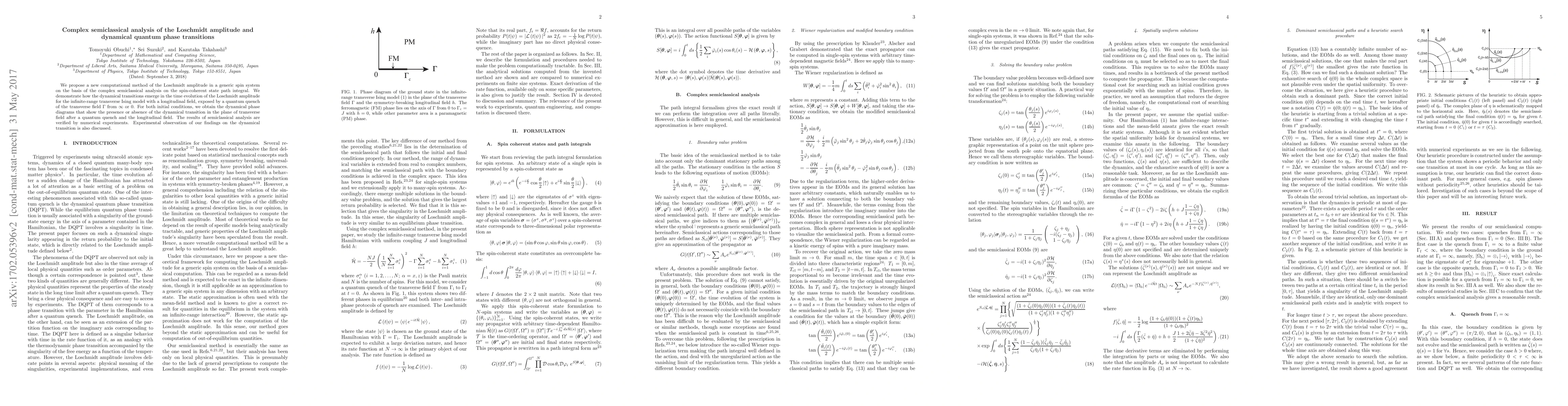 We propose a new computational method of the Loschmidt amplitude in a generic spin system on the basis of the complex semiclassical analysis on the spin-coherent state path integral. We demonstrate how the dynamical transitions emerge in the time evolution of the Loschmidt amplitude for the infinite-range transverse Ising model with a longitudinal field, exposed by a quantum quench of the transverse field $\Gamma$ from $\infty$ or $0$. For both initial conditions, we obtain the dynamical phase diagrams that show the presence or absence of the dynamical transition in the plane of transverse field after a quantum quench and the longitudinal field. The results of semiclassical analysis are verified by numerical experiments. Experimental observation of our findings on the dynamical transition is also discussed.