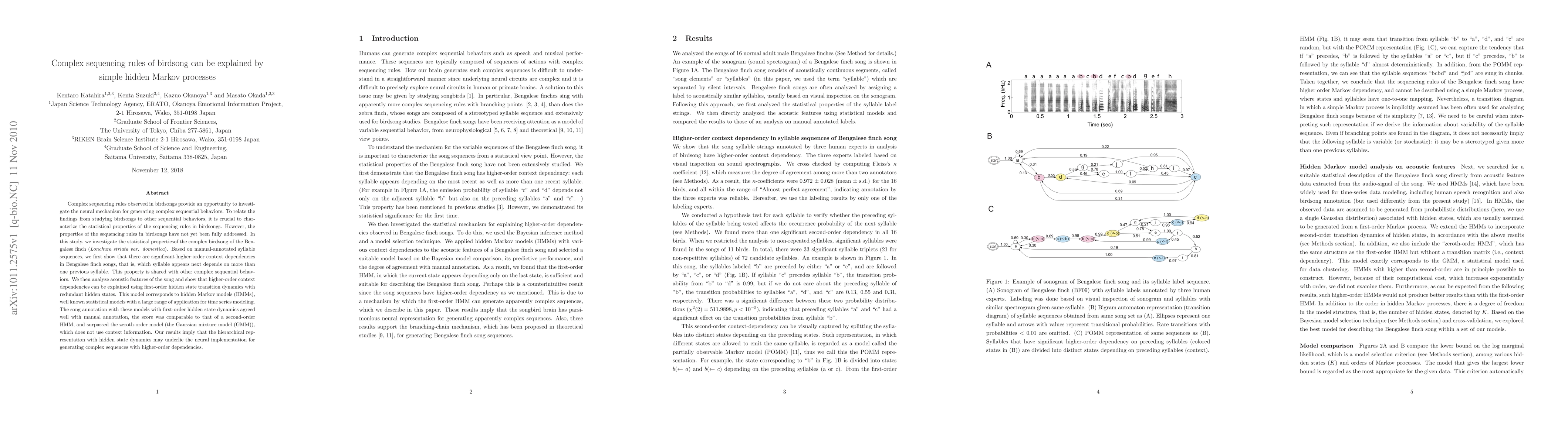 This study reveals that complex Bengalese finch birdsongs exhibit higher-order context dependencies, meaning subsequent syllables depend on multiple preceding ones. These dependencies can be modeled using simple hidden Markov processes, suggesting a neural basis for generating complex sequential behaviors similar to those in other areas.