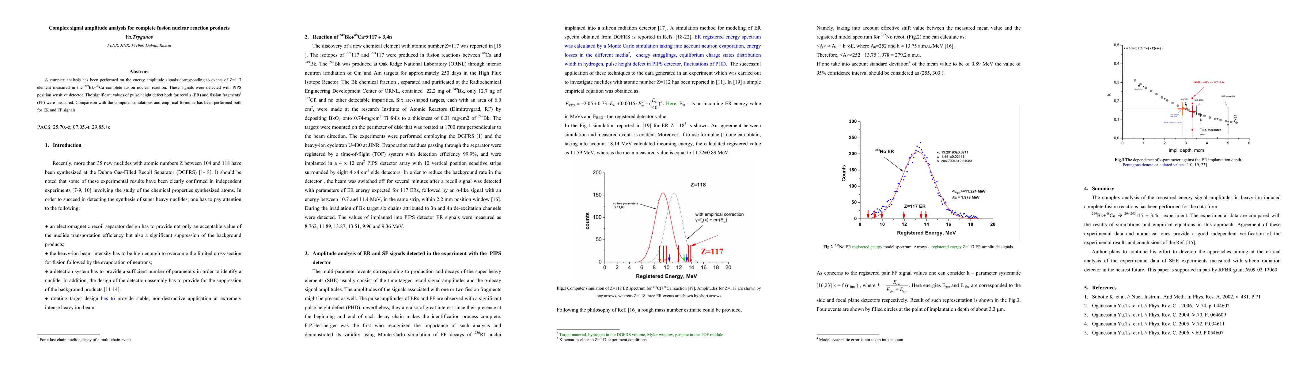 A complex analysis has been performed on the energy amplitude signals corresponding to events of Z=117 element measured in the 249Bk+48Ca complete fusion nuclear reaction. These signals were detected with PIPS position sensitive detector. The significant values of pulse height defect both for recoils (ER) and fission fragments (FF) were measured. Comparison with the computer simulations and empirical formulae has been performed both for ER and FF signals.
