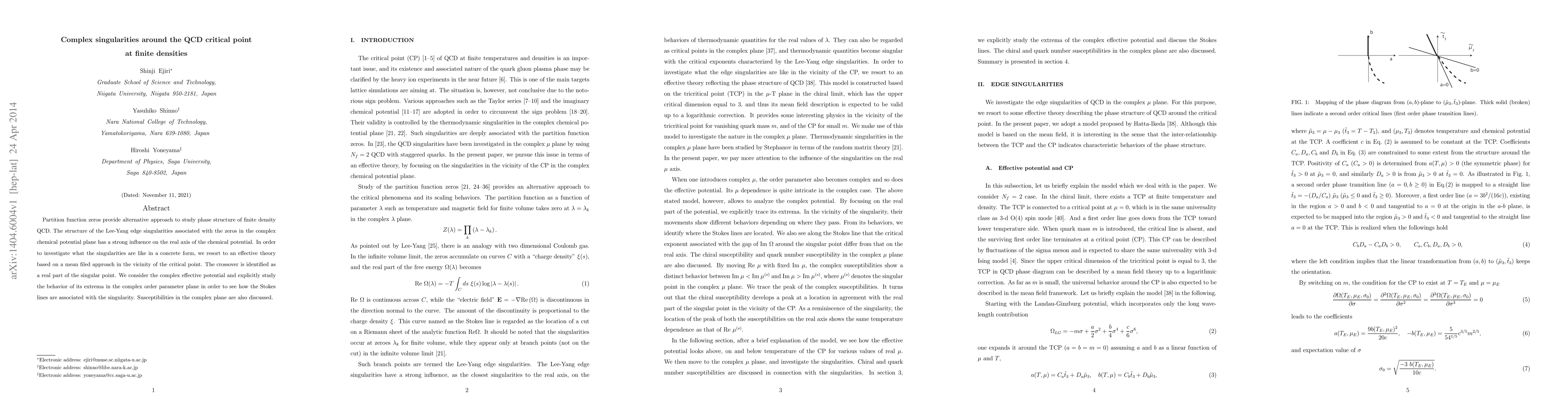 Partition function zeros provide alternative approach to study phase structure of finite density QCD. The structure of the Lee-Yang edge singularities associated with the zeros in the complex chemical potential plane has a strong influence on the real axis of the chemical potential. In order to investigate what the singularities are like in a concrete form, we resort to an effective theory based on a mean field approach in the vicinity of the critical point. The crossover is identified as a real part of the singular point. We consider the complex effective potential and explicitly study the behavior of its extrema in the complex order parameter plane in order to see how the Stokes lines are associated with the singularity. Susceptibilities in the complex plane are also discussed.