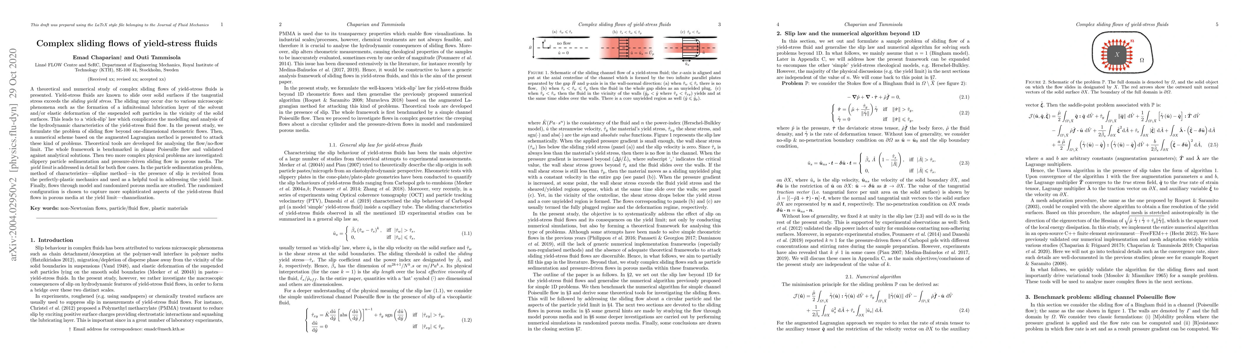This paper presents a theoretical and numerical study on complex sliding flows of yield-stress fluids, focusing on the stick-slip behavior and the yield limit. The study formulates a numerical scheme based on the augmented Lagrangian method and benchmarks it against planar Poiseuille flow, then investigates more complex scenarios like slippery particle sedimentation and pressure-driven flow in porous media.