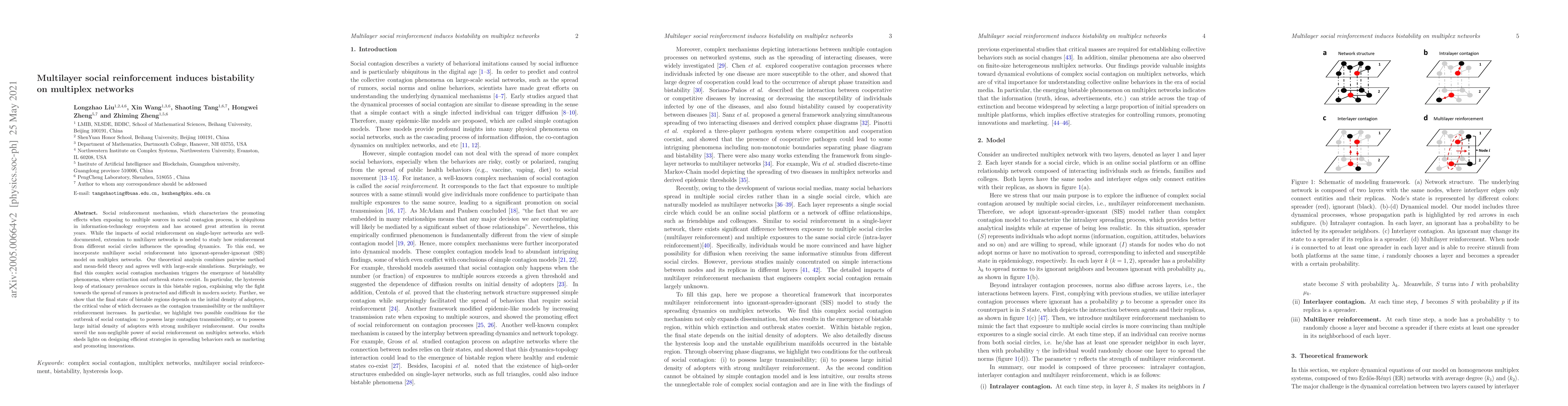This research explores how social reinforcement mechanisms on multiplex networks lead to bistability in complex contagion processes, finding that such reinforcement can cause both extinction and outbreak states to coexist. The study shows that initial adopter density and contagion transmissibility critically determine the final state, highlighting the protracted difficulty in controlling rumor spread in modern society.