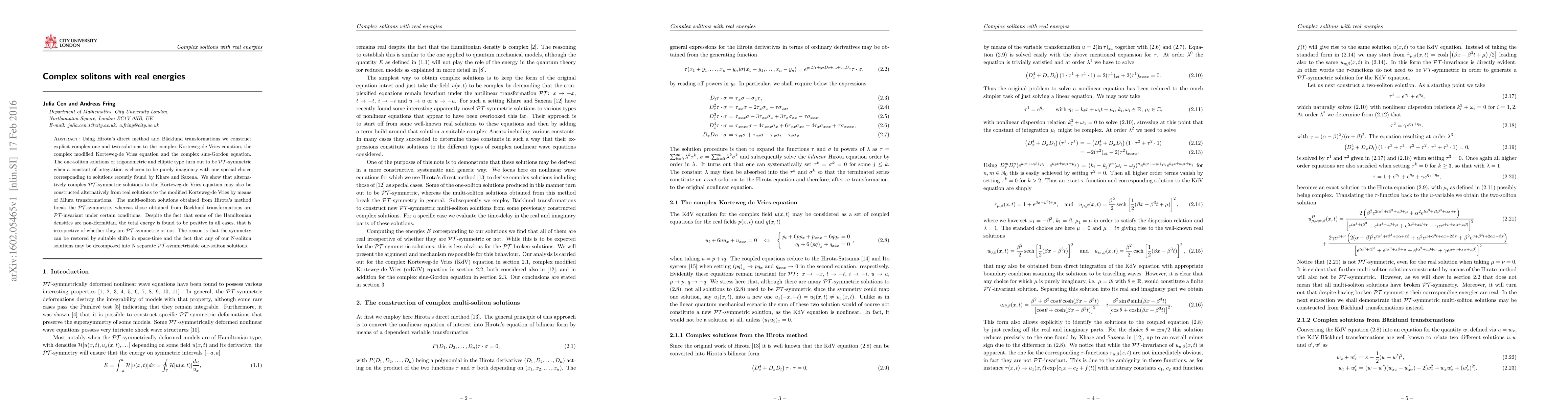 Using Hirota's direct method and Baecklund transformations we construct explicit complex one and two-solutions to the complex Korteweg-de Vries equation, the complex modified Korteweg-de Vries equation and the complex sine-Gordon equation. The one-soliton solutions of trigonometric and elliptic type turn out to be PT-symmetric when a constant of integration is chosen to be purely imaginary with one special choice corresponding to solutions recently found by Khare and Saxena. We show that alternatively complex PT-symmetric solutions to the Korteweg-de Vries equation may also be constructed alternatively from real solutions to the modified Korteweg-de Vries by means of Miura transformations. The multi-soliton solutions obtained from Hirota's method break the PT-symmetric, whereas those obtained from Baecklund transformations are PT-invariant under certain conditions. Despite the fact that some of the Hamiltonian densities are non-Hermitian, the total energy is found to be positive in all cases, that is irrespective of whether they are PT-symmetric or not. The reason is that the symmetry can be restored by suitable shifts in space-time and the fact that any of our N-soliton solutions may be decomposed into N separate PT-symmetrizable one-soliton solutions.