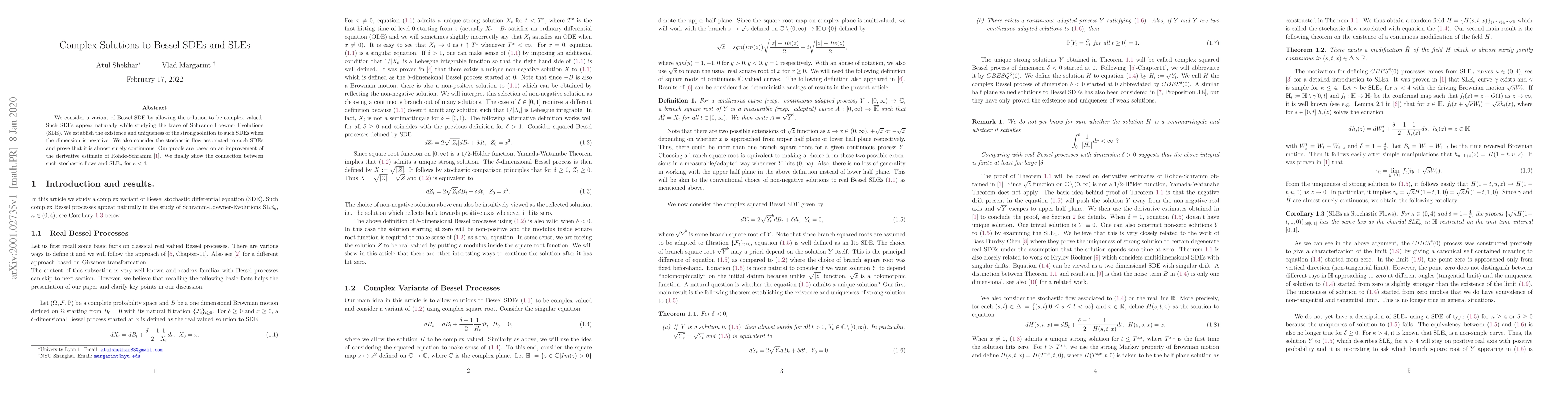 We consider a variant of Bessel SDE by allowing the solution to be complex valued. Such SDEs appear naturally while studying the trace of Schramm-Loewner-Evolutions (SLE). We establish the existence and uniqueness of the strong solution to such SDEs when the dimension is negative. We also consider the stochastic flow associated to such SDEs and prove that it is almost surely continuous. Our proofs are based on an improvement of the derivative estimate of Rohde-Schramm \cite{RS05}. We finally show the connection between such stochastic flows and SLE$_{\kappa}$ for $\kappa <4$.