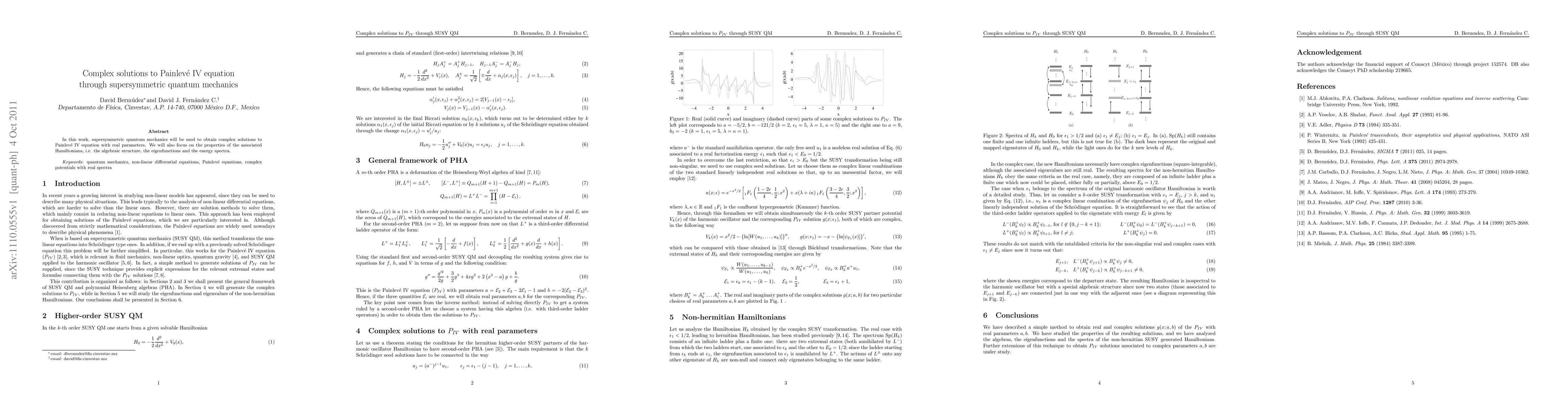 In this work, supersymmetric quantum mechanics will be used to obtain complex solutions to Painleve IV equation with real parameters. We will also focus on the properties of the associated Hamiltonians, i.e. the algebraic structure, the eigenfunctions and the energy spectra.