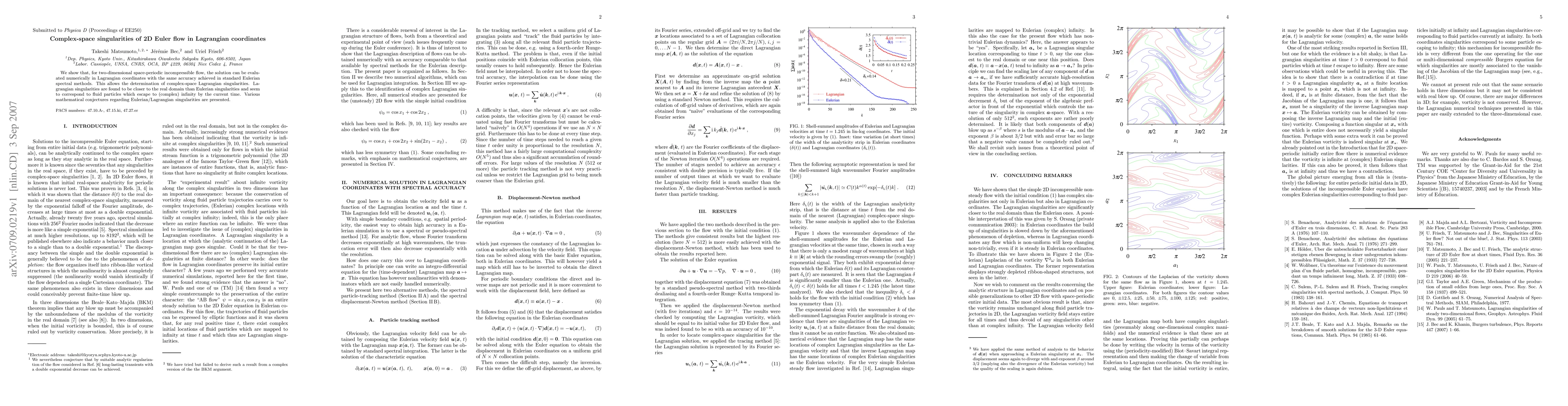 The research demonstrates numerical evaluation of 2D space-periodic incompressible flow in Lagrangian coordinates, matching Eulerian spectral accuracy. Lagrangian singularities are closer to the real domain than Eulerian ones, suggesting they correspond to particles escaping to complex infinity, with associated mathematical conjectures on Eulerian/Lagrangian singularities presented.