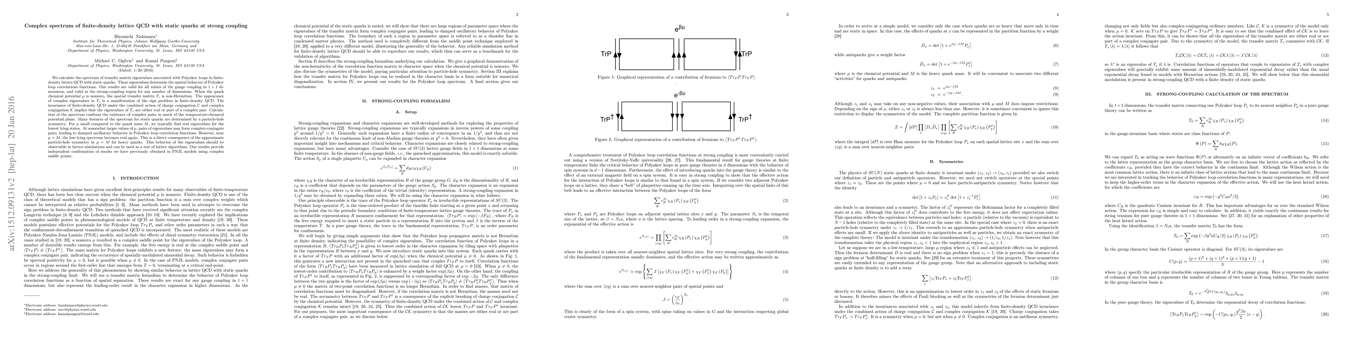 We calculate the spectrum of transfer matrix eigenvalues associated with Polyakov loops in finite-density lattice QCD with static quarks. These eigenvalues determine the spatial behavior of Polyakov loop correlations functions. Our results are valid for all values of the gauge coupling in $1+1$ dimensions, and valid in the strong-coupling region for any number of dimensions. When the quark chemical potential $\mu$ is nonzero, the spatial transfer matrix $T_s$ is non-Hermitian. The appearance of complex eigenvalues in $T_s$ is a manifestation of the sign problem in finite-density QCD. The invariance of finite-density QCD under the combined action of charge conjugation $\mathcal{C}$ and complex conjugation $\mathcal{K}$ implies that the eigenvalues of $T_s$ are either real or part of a complex pair. Calculation of the spectrum confirms the existence of complex pairs in much of the temperature-chemical potential plane. Many features of the spectrum for static quarks are determined by a particle-hole symmetry. For $\mu$ small compared to the quark mass $M$, we typically find real eigenvalues for the lowest lying states. At somewhat larger values of $\mu,$ pairs of eigenvalues may form complex-conjugate pairs, leading to damped oscillatory behavior in Polyakov loop correlation functions. However, near $\mu=M$, the low-lying spectrum becomes real again. This is a direct consequence of the approximate particle-hole symmetry at $\mu=M$ for heavy quarks. This behavior of the eigenvalues should be observable in lattice simulations and can be used as a test of lattice algorithms. Our results provide independent confirmation of results we have previously obtained in PNJL models using complex saddle points.