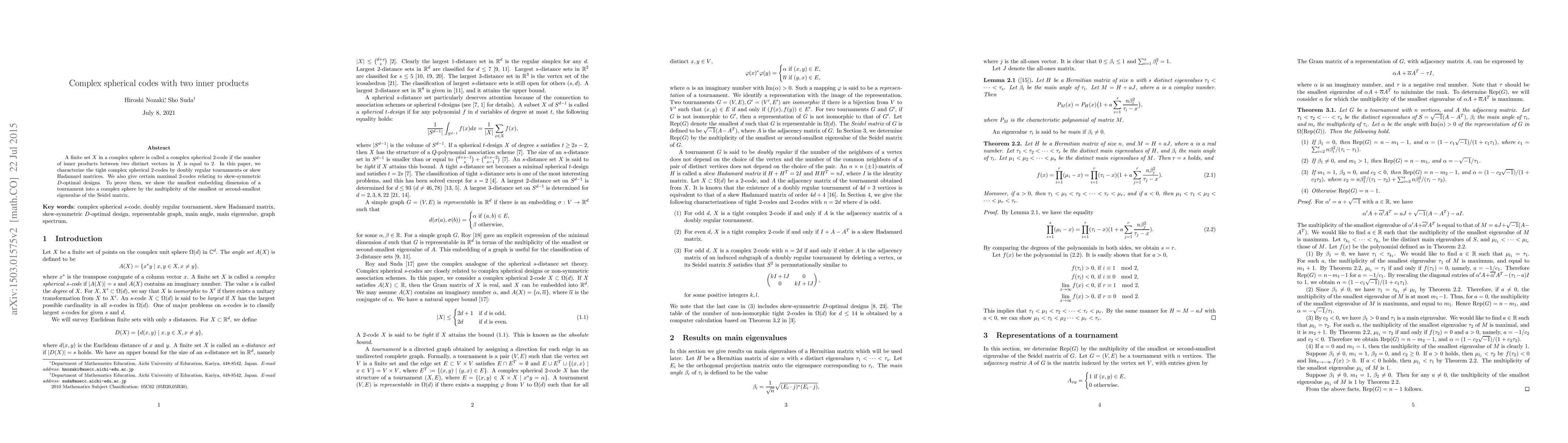 This paper characterizes tight complex spherical $2$-codes using doubly regular tournaments and skew Hadamard matrices, and explores maximal $2$-codes linked to skew-symmetric $D$-optimal designs. The proof involves determining the smallest embedding dimension of a tournament in a complex sphere using the eigenvalues of the Seidel matrix.