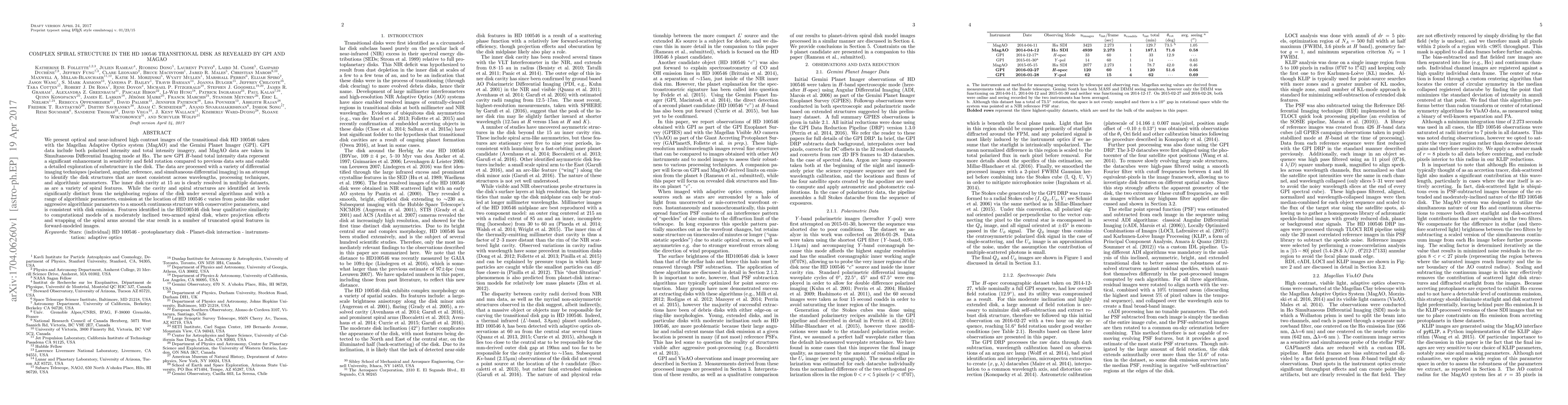 We present optical and near-infrared high contrast images of the transitional disk HD 100546 taken with the Magellan Adaptive Optics system (MagAO) and the Gemini Planet Imager (GPI). GPI data include both polarized intensity and total intensity imagery, and MagAO data are taken in Simultaneous Differential Imaging mode at H{\alpha}. The new GPI H -band total intensity data represent a significant enhancement in sensitivity and field rotation compared to previous data sets and enable a detailed exploration of substructure in the disk. The data are processed with a variety of differential imaging techniques (polarized, angular, reference, and simultaneous differential imaging) in an attempt to identify the disk structures that are most consistent across wavelengths, processing techniques, and algorithmic parameters. The inner disk cavity at 15 au is clearly resolved in multiple datasets, as are a variety of spiral features. While the cavity and spiral structures are identified at levels significantly distinct from the neighboring regions of the disk under several algorithms and with a range of algorithmic parameters, emission at the location of HD 100546 c varies from point-like under aggressive algorithmic parameters to a smooth continuous structure with conservative parameters, and is consistent with disk emission. Features identified in the HD100546 disk bear qualitative similarity to computational models of a moderately inclined two-armed spiral disk, where projection effects and wrapping of the spiral arms around the star result in a number of truncated spiral features in forward-modeled images.
