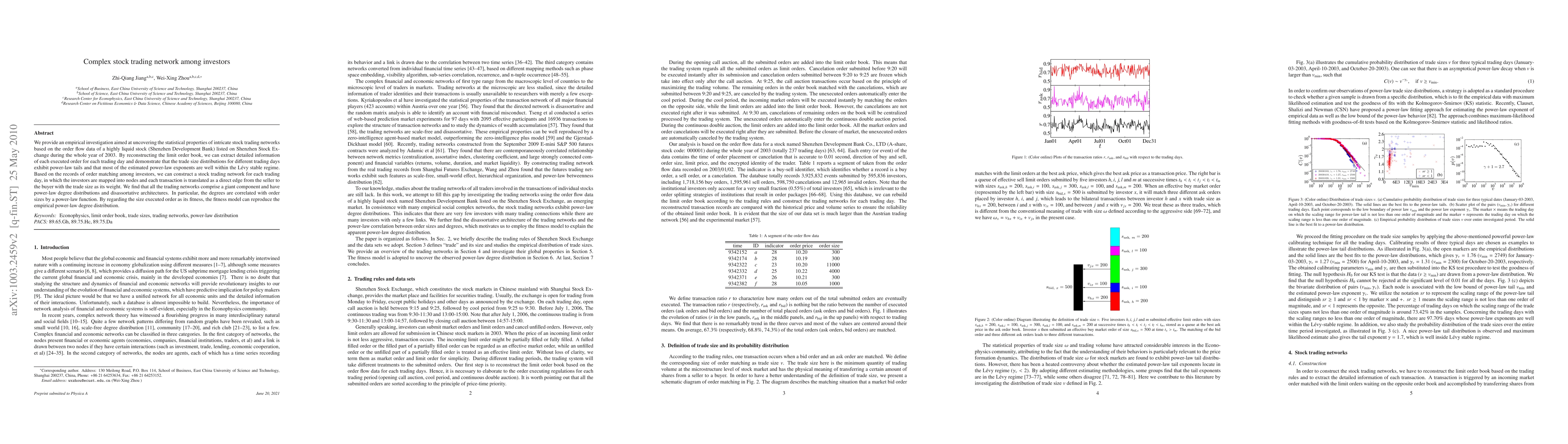 This study investigates the statistical properties of stock trading networks using order flow data from Shenzhen Development Bank in 2003, revealing power-law tails in trade size distributions and a giant component in trading networks with power-law degree distributions and disassortative architecture. The fitness model based on executed order size correlates well with empirical findings.