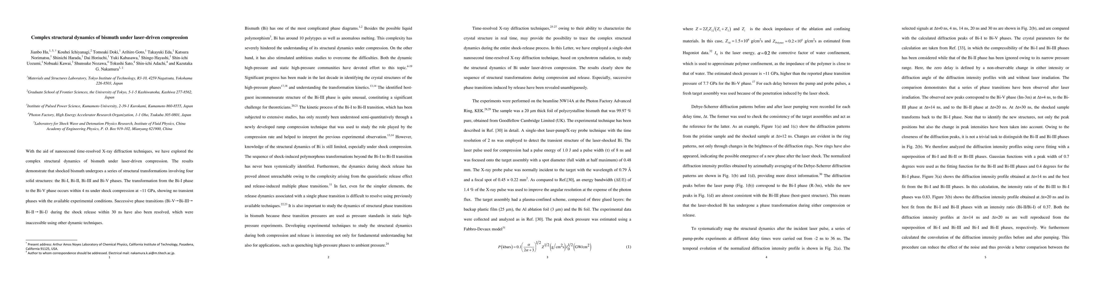 This study investigates the structural dynamics of bismuth under laser-driven compression using nanosecond time-resolved X-ray diffraction, revealing a series of phase transformations from Bi-I to Bi-V within 4 ns at ~11 GPa, followed by reverse transitions during decompression within 30 ns. These transformations were previously inaccessible with other dynamic techniques.