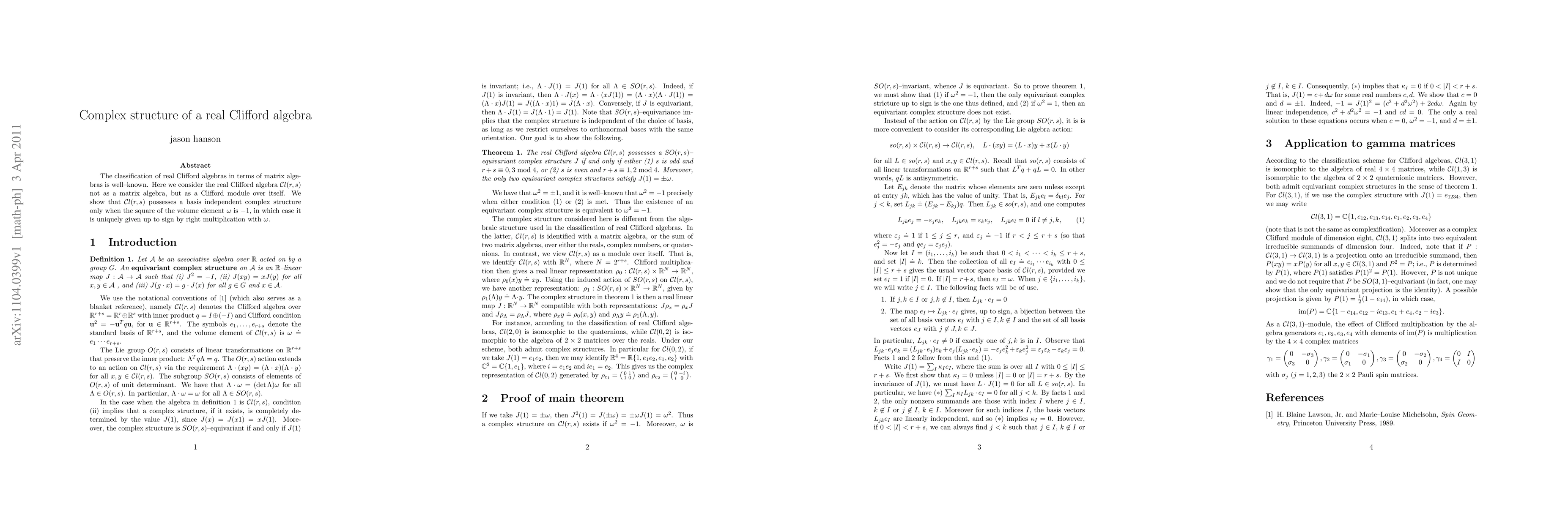 This paper investigates the real Clifford algebra ${\mathcal Cl}(r,s)$ as a Clifford module, demonstrating its unique complex structure dependent on the square of the volume element $\omega$ being -1, with the structure given by right multiplication with $\omega$ up to sign.