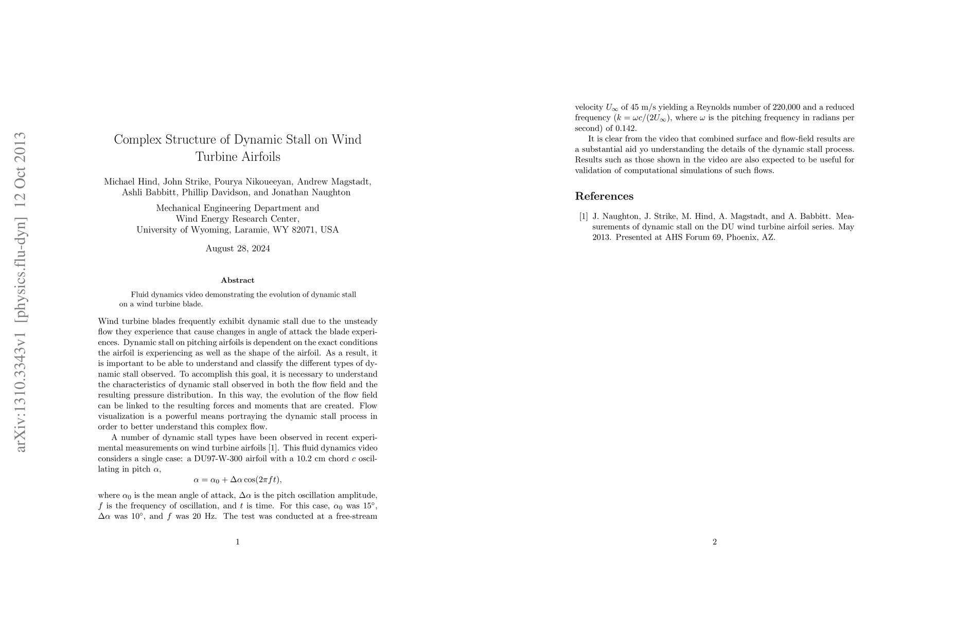 Summary: This study visually captures the fluid dynamics of dynamic stall on wind turbine airfoils, providing insights into the complex flow patterns and their evolution over time. The video analysis highlights critical phenomena affecting wind turbine efficiency.