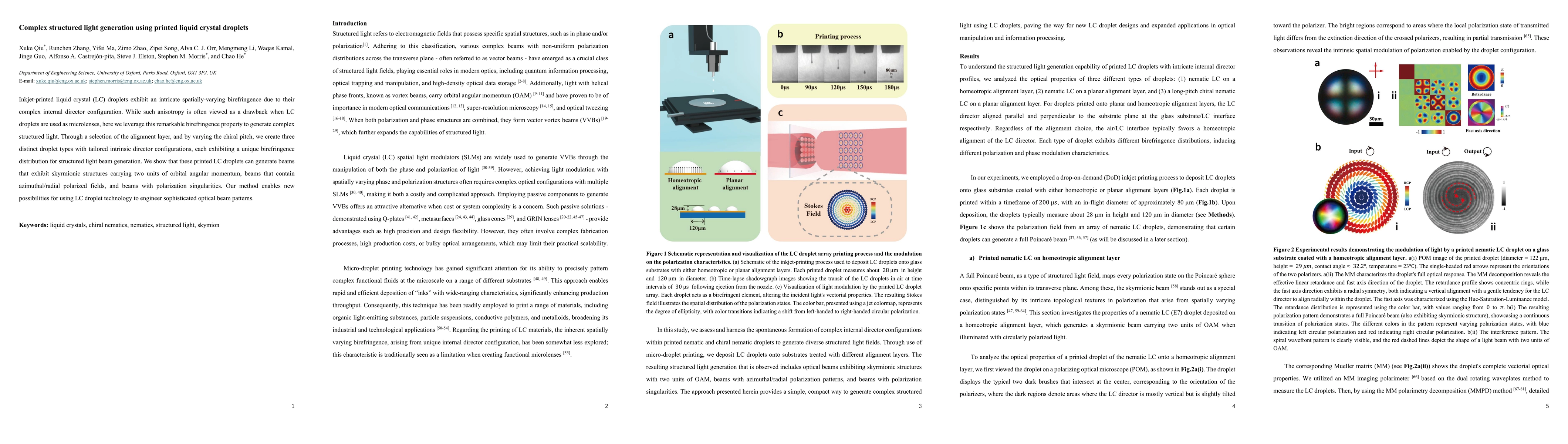 Inkjet-printed liquid crystal (LC) droplets exhibit an intricate spatially-varying birefringence due to their complex internal director configuration. While such anisotropy is often viewed as a drawback when LC droplets are used as microlenses, here we leverage this remarkable birefringence property to generate complex structured light. Through a selection of the alignment layer, and by varying the chiral pitch, we create three distinct droplet types with tailored intrinsic director configurations, each exhibiting a unique birefringence distribution for structured light beam generation. We show that these printed LC droplets can generate beams that exhibit skyrmionic structures carrying two units of orbital angular momentum, beams that contain azimuthal/radial polarized fields, and beams with polarization singularities. Our method enables new possibilities for using LC droplet technology to engineer sophisticated optical beam patterns.