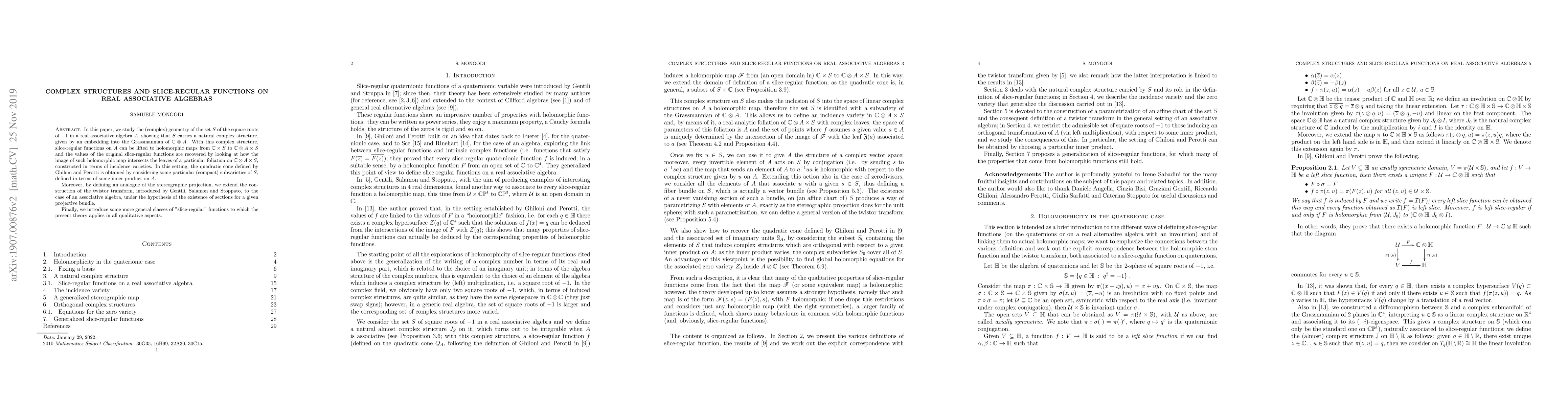 This paper explores the complex geometry of the set $S$ of square roots of $-1$ in a real associative algebra $A$, revealing a natural complex structure. It demonstrates how slice-regular functions on $A$ can be lifted to holomorphic maps, and introduces a twistor transform analogue for associative algebras.