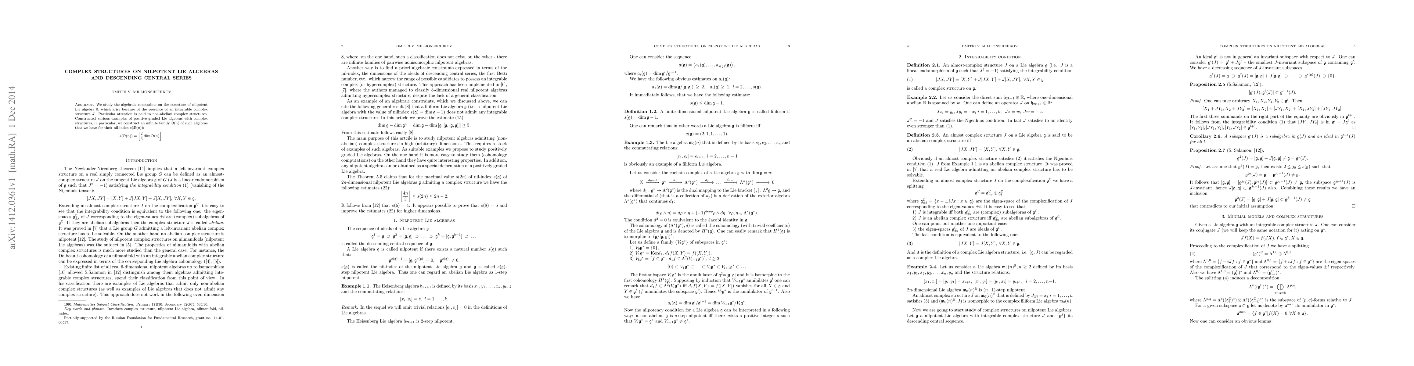 We study the algebraic constraints on the structure of nilpotent Lie algebra $\mathbb{g}$, which arise because of the presence of an integrable complex structure $J$. Particular attention is paid to non-abelian complex structures. Constructed various examples of positive graded Lie algebras with complex structures, in particular, we construct an infinite family $\mathfrak{D}(n)$ of such algebras that we have for their nil-index $s(\mathfrak{D}(n))$: $$ s(\mathfrak{D}(n))=[ \frac{2}{3}\dim{\mathfrak{D}(n)} ]. $$