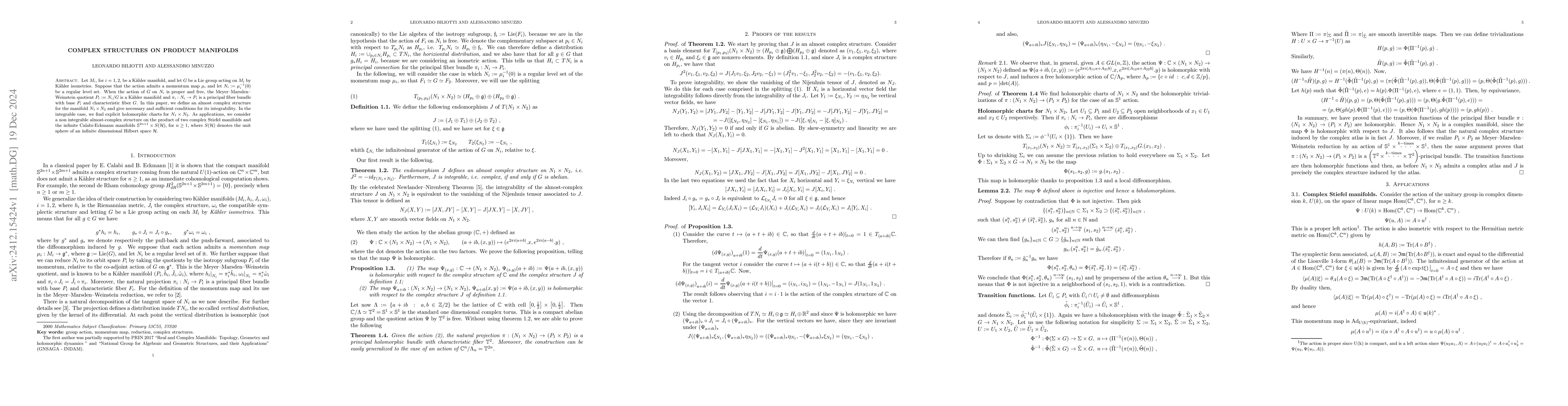 Let $M_i$, for $i=1,2$, be a K\"ahler manifold, and let $G$ be a Lie group acting on $M_i$ by K\"ahler isometries. Suppose that the action admits a momentum map $\mu_i$ and let $N_i:=\mu_i^{-1}(0)$ be a regular level set. When the action of $G$ on $N_i$ is proper and free, the Meyer--Marsden--Weinstein quotient $P_i:=N_i/G$ is a K\"ahler manifold and $\pi_i:N_i\to P_i$ is a principal fiber bundle with base $P_i$ and characteristic fiber $G$. In this paper, we define an almost complex structure for the manifold $N_1\times N_2$ and give necessary and sufficient conditions for its integrability. In the integrable case, we find explicit holomorphic charts for $N_1\times N_2$. As applications, we consider a non integrable almost-complex structure on the product of two complex Stiefel manifolds and the infinite Calabi-Eckmann manifolds $\mathbb S^{2n+1}\times S(\mathcal{H})$, for $n\geq 1$, where $S(\mathcal{H})$ denotes the unit sphere of an infinite dimensional Hilbert space $\mathcal{H}$
