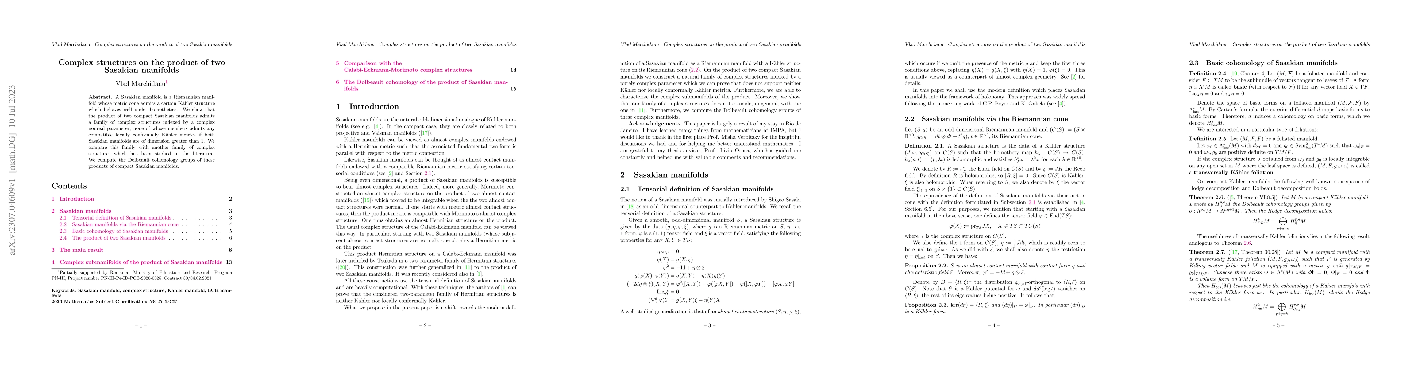 A Sasakian manifold is a Riemannian manifold whose metric cone admits a certain K\"ahler structure which behaves well under homotheties. We show that the product of two compact Sasakian manifolds admits a family of complex structures indexed by a complex nonreal parameter, none of whose members admits any compatible locally conformally K\"ahler metrics if both Sasakian manifolds are of dimension greater than $1$. We compare this family with another family of complex structures which has been studied in the literature. We compute the Dolbeault cohomology groups of these products of compact Sasakian manifolds.
