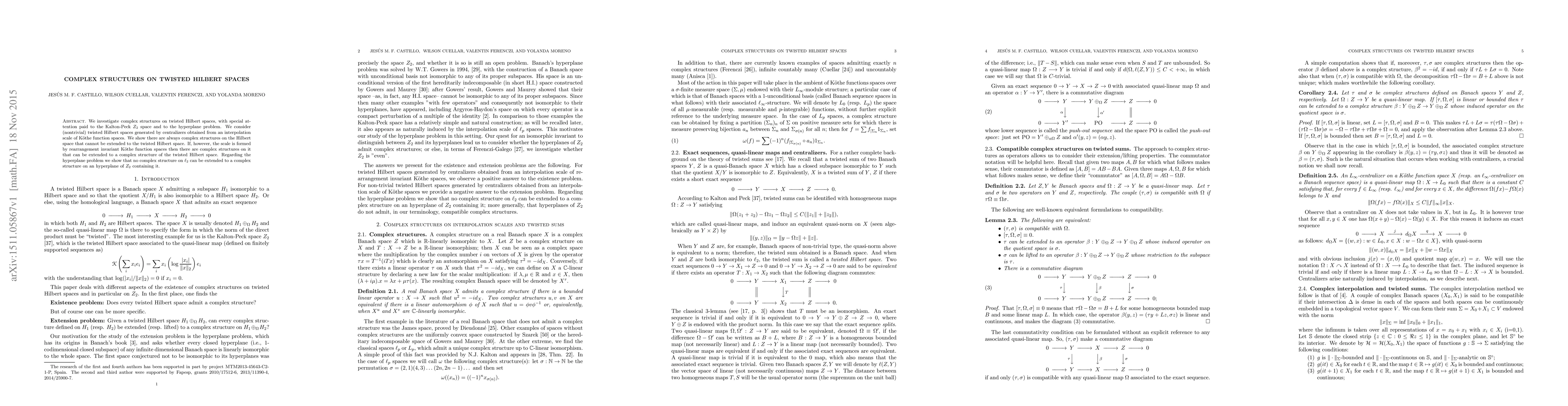 This paper explores complex structures on twisted Hilbert spaces, focusing on the Kalton-Peck $Z_2$ space and the hyperplane problem. It demonstrates that while some complex structures on Hilbert spaces cannot extend to twisted spaces, those derived from rearrangement invariant K\"othe function spaces can. Additionally, it concludes that no complex structure on $\ell_2$ can extend to a hyperplane of $Z_2$.