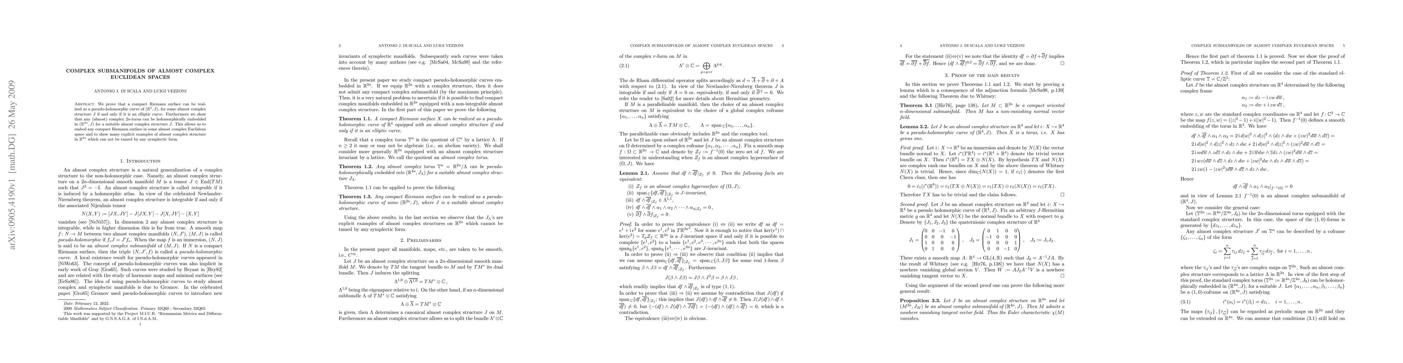 This paper proves that a compact Riemann surface can be embedded as a pseudo-holomorphic curve in an almost complex Euclidean space if and only if it is an elliptic curve. It also demonstrates the holomorphic embedding of complex $2n$-tori in $\mathbb{R}^{4n}$ under suitable almost complex structures.