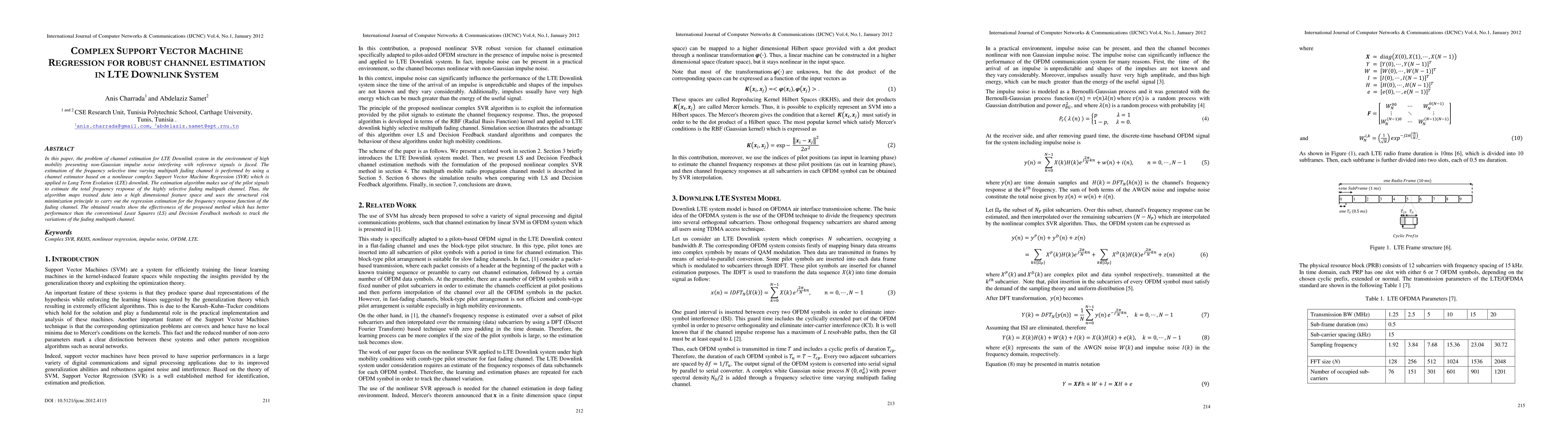 In this paper, the problem of channel estimation for LTE Downlink system in the environment of high mobility presenting non-Gaussian impulse noise interfering with reference signals is faced. The estimation of the frequency selective time varying multipath fading channel is performed by using a channel estimator based on a nonlinear complex Support Vector Machine Regression (SVR) which is applied to Long Term Evolution (LTE) downlink. The estimation algorithm makes use of the pilot signals to estimate the total frequency response of the highly selective fading multipath channel. Thus, the algorithm maps trained data into a high dimensional feature space and uses the structural risk minimization principle to carry out the regression estimation for the frequency response function of the fading channel. The obtained results show the effectiveness of the proposed method which has better performance than the conventional Least Squares (LS) and Decision Feedback methods to track the variations of the fading multipath channel.