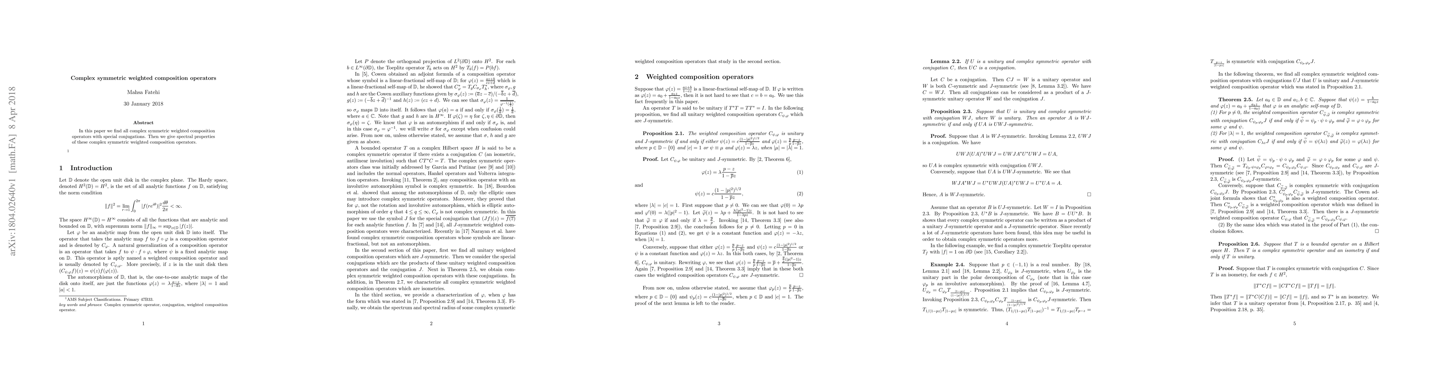 Summary: This paper identifies all complex symmetric weighted composition operators under specific conjugations and explores their spectral properties in detail.