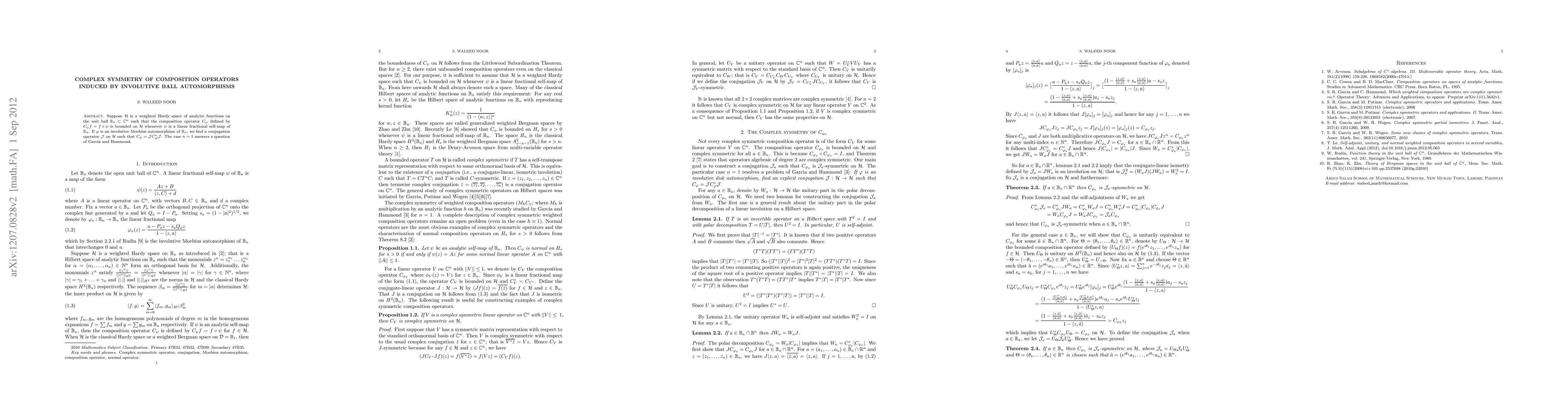 Researchers find a conjugation operator that simplifies the study of composition operators induced by involutive Ball automorphisms on weighted Hardy spaces of analytic functions.