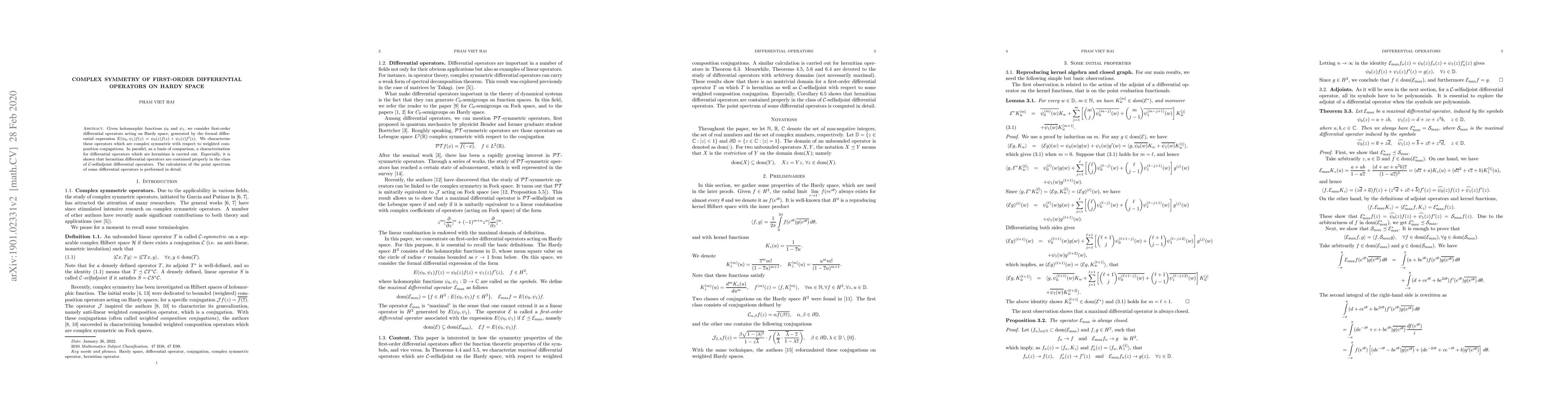 This paper characterizes complex symmetric first-order differential operators on Hardy space generated by holomorphic functions, and compares them with hermitian operators. It demonstrates that hermitian operators are a subset of $\calC$-selfadjoint operators, and provides detailed calculations of the point spectrum for certain operators.