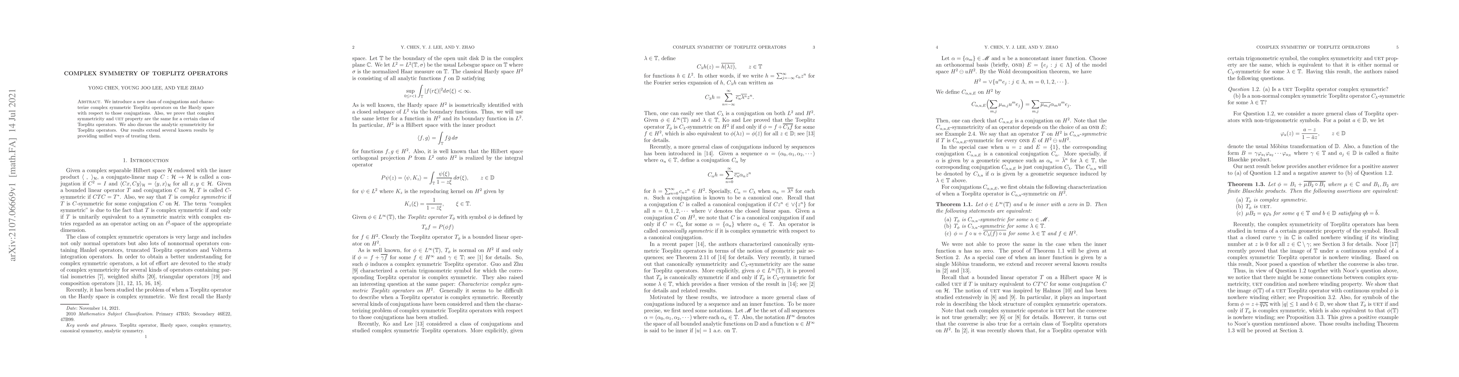 We introduce a new class of conjugations and characterize complex symmetric Toeplitz operators on the Hardy space with respect to those conjugations. Also, we prove that complex symmetricity and \uet~ property are the same for a certain class of Toeplitz operators. We also discuss the analytic symmetricity for Toeplitz operators. Our results extend several known results by providing unified ways of treating them.