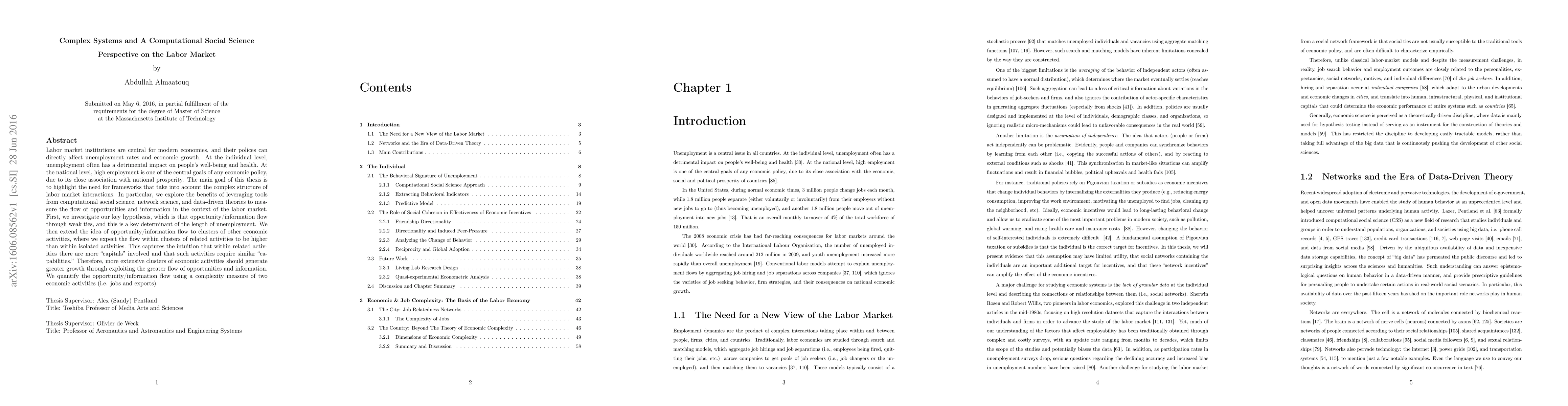Labor market institutions are central for modern economies, and their polices can directly affect unemployment rates and economic growth. At the individual level, unemployment often has a detrimental impact on people's well-being and health. At the national level, high employment is one of the central goals of any economic policy, due to its close association with national prosperity. The main goal of this thesis is to highlight the need for frameworks that take into account the complex structure of labor market interactions. In particular, we explore the benefits of leveraging tools from computational social science, network science, and data-driven theories to measure the flow of opportunities and information in the context of the labor market. First, we investigate our key hypothesis, which is that opportunity/information flow through weak ties, and this is a key determinant of the length of unemployment. We then extend the idea of opportunity/information flow to clusters of other economic activities, where we expect the flow within clusters of related activities to be higher than within isolated activities. This captures the intuition that within related activities there are more "capitals" involved and that such activities require similar "capabilities." Therefore, more extensive clusters of economic activities should generate greater growth through exploiting the greater flow of opportunities and information. We quantify the opportunity/information flow using a complexity measure of two economic activities (i.e. jobs and exports).