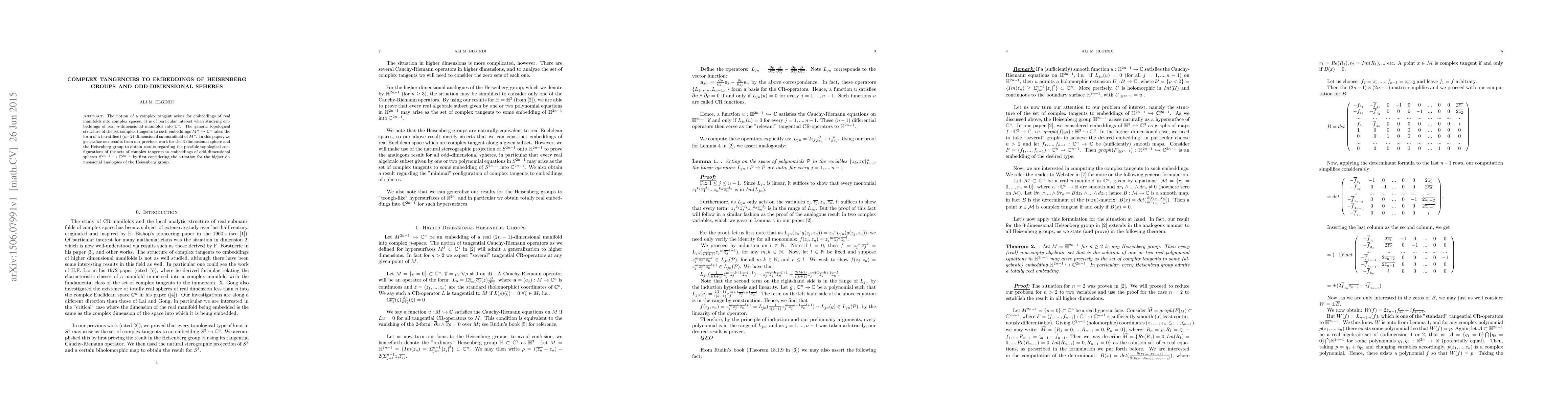 This paper extends previous research on complex tangents to embeddings of real manifolds into complex spaces, focusing on odd-dimensional spheres and higher-dimensional Heisenberg groups. It reveals topological configurations of complex tangents for embeddings of $S^{2n-1}$ into $mathbb{C}^{2n-1}$.