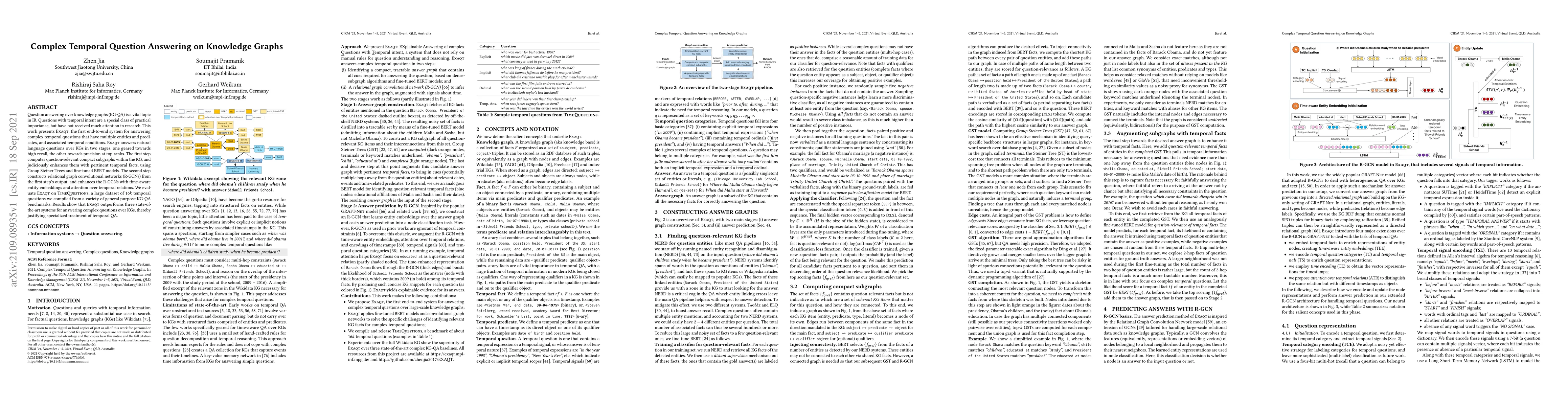 This paper introduces EXAQT, the first end-to-end system for answering complex temporal questions over knowledge graphs, employing two stages: a recall-focused subgraph extraction and a precision-focused R-GCN construction, achieving superior performance on a new large dataset.
