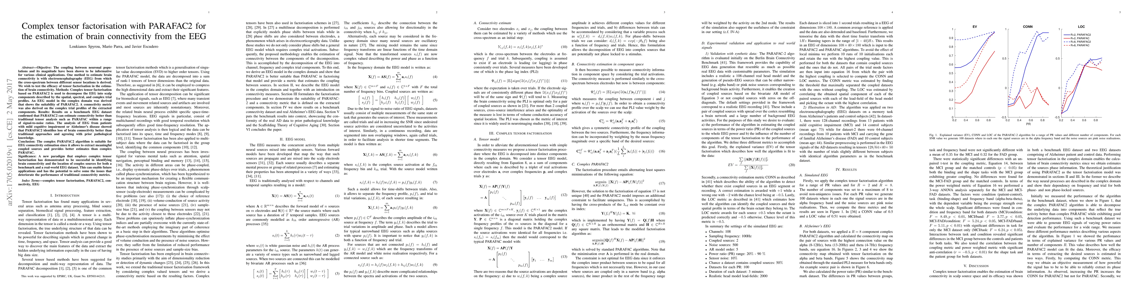 This paper tests the efficacy of complex tensor factorisation using PARAFAC2 for estimating brain connectivity from EEG data. Results show that PARAFAC2 outperforms traditional methods, especially in identifying connectivity loss in patients with mild cognitive impairment or Alzheimer's disease, indicating its potential for clinical applications.
