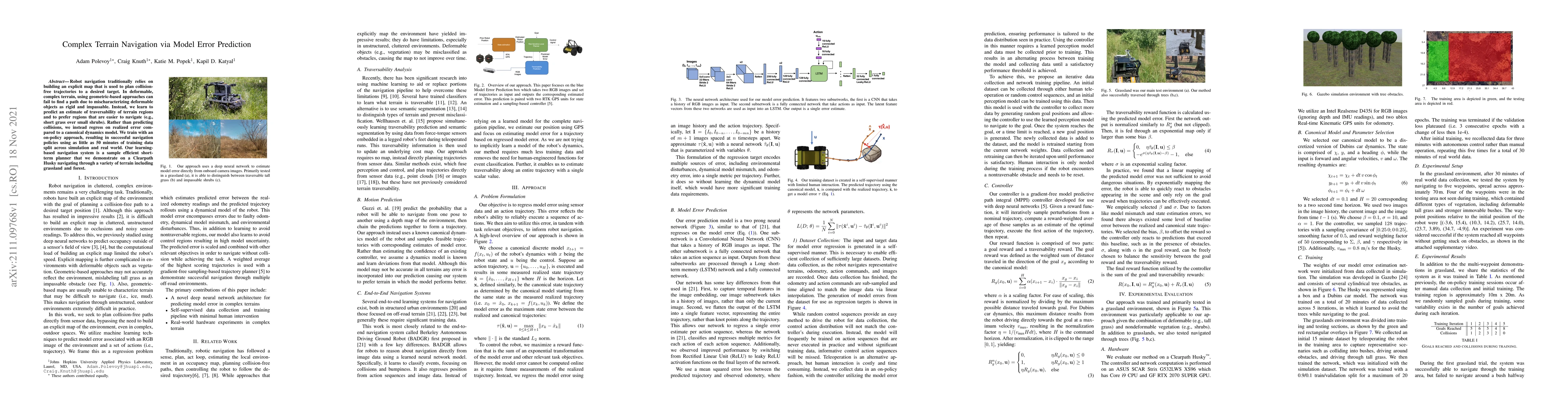 This paper proposes a learning-based navigation system for robots in complex terrain, predicting traversability instead of relying on rigid maps. It trains a model to predict navigation error, achieving successful navigation with minimal training data, demonstrated on a Clearpath Husky in diverse environments.
