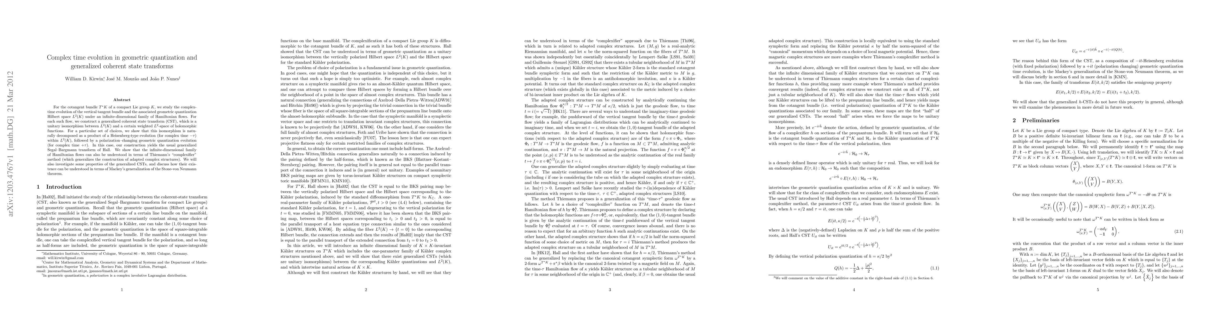 This paper studies the complex-time evolution of geometric quantization on the cotangent bundle of a compact Lie group, constructing generalized coherent state transforms that decompose into Heisenberg and polarization-changing geometric quantization evolutions. The work also ties these transformations to Thiemann's complexifier method and explores their properties via Mackey's generalization of the Stone-von Neumann theorem.