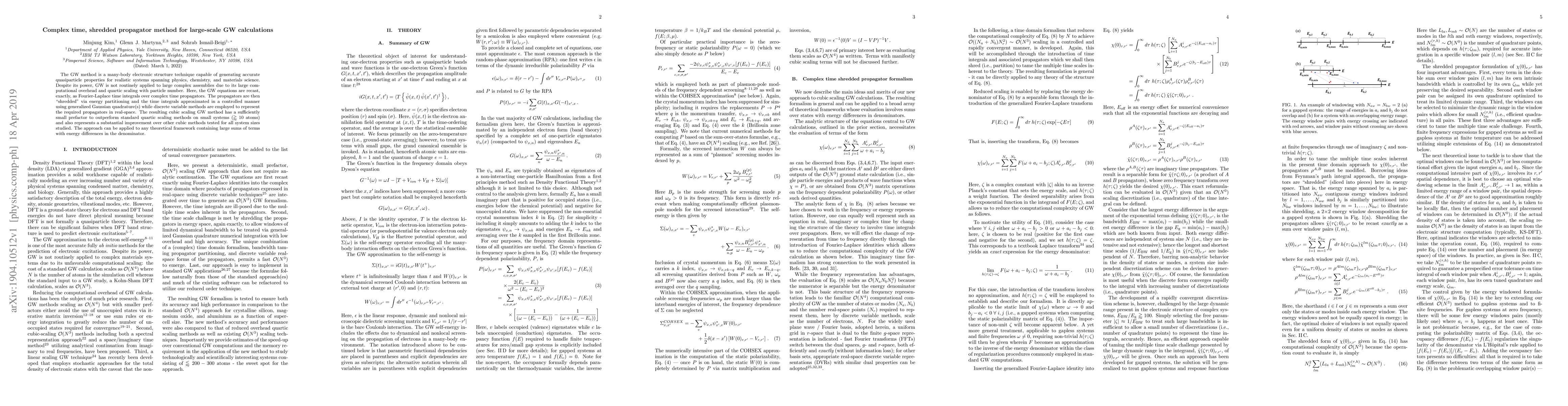 The reformulation of GW equations as complex time, shredded propagator method for large-scale GW calculations, leading to a cubic-scaling approach.