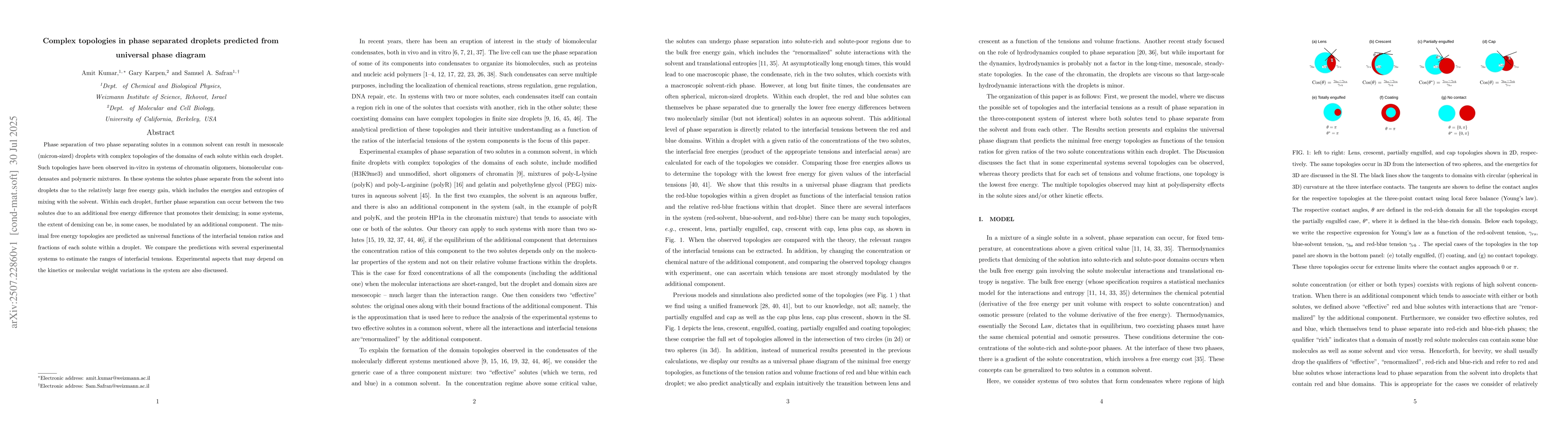 The research uses theoretical modeling to predict the minimal interfacial free energy topologies of phase-separated droplets formed by two solutes in a common solvent, based on interfacial tension ratios and volume fractions.