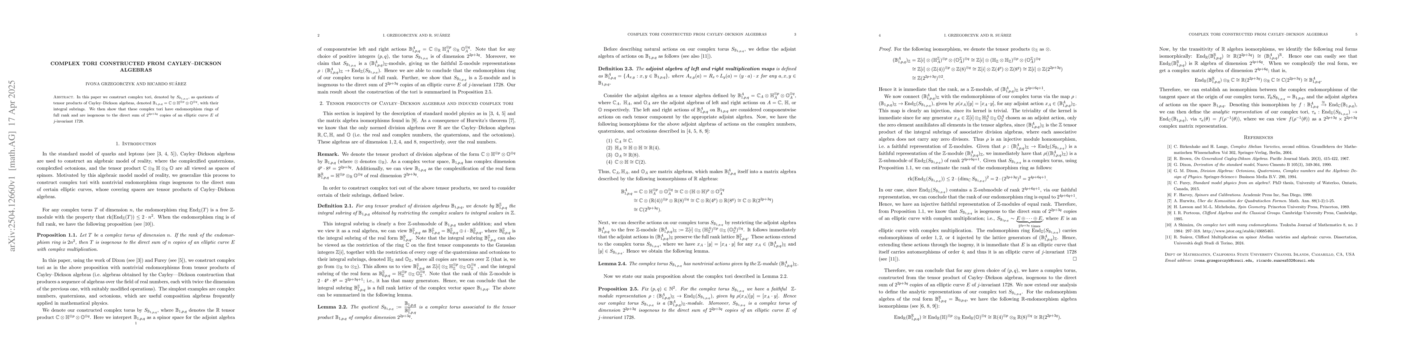 Researchers construct complex tori from Cayley-Dickson algebras, showing they have full-rank endomorphism rings and are isogenous to the direct sum of elliptic curves with specific j-invariant properties.