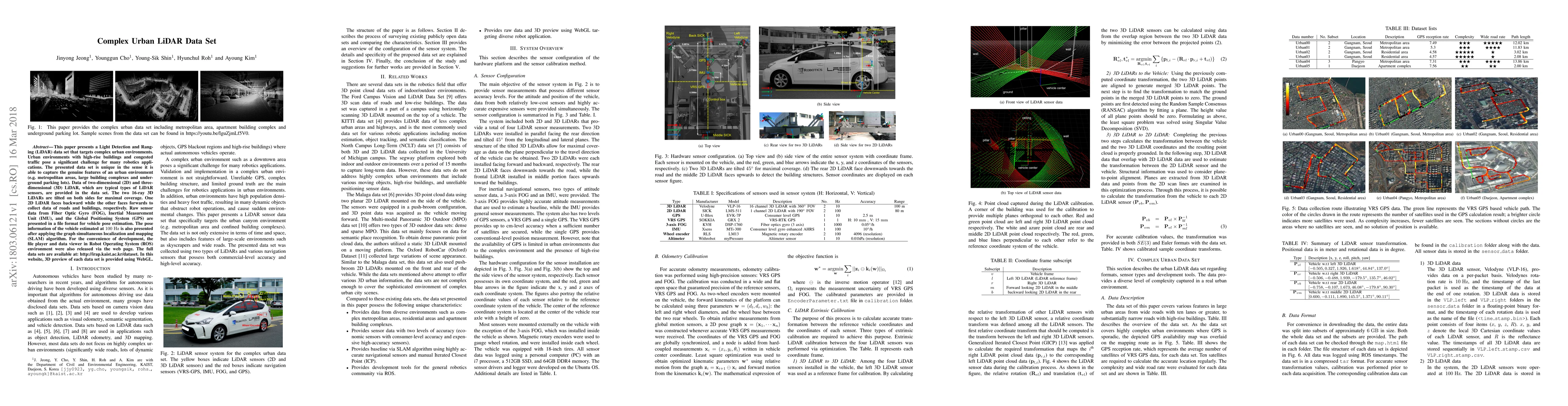 This paper presents a Light Detection and Ranging (LiDAR) data set that targets complex urban environments. Urban environments with high-rise buildings and congested traffic pose a significant challenge for many robotics applications. The presented data set is unique in the sense it is able to capture the genuine features of an urban environment (e.g. metropolitan areas, large building complexes and underground parking lots). Data of two-dimensional (2D) and threedimensional (3D) LiDAR, which are typical types of LiDAR sensors, are provided in the data set. The two 16-ray 3D LiDARs are tilted on both sides for maximal coverage. One 2D LiDAR faces backward while the other faces forwards to collect data of roads and buildings, respectively. Raw sensor data from Fiber Optic Gyro (FOG), Inertial Measurement Unit (IMU), and the Global Positioning System (GPS) are presented in a file format for vehicle pose estimation. The pose information of the vehicle estimated at 100 Hz is also presented after applying the graph simultaneous localization and mapping (SLAM) algorithm. For the convenience of development, the file player and data viewer in Robot Operating System (ROS) environment were also released via the web page. The full data sets are available at: http://irap.kaist.ac.kr/dataset. In this website, 3D preview of each data set is provided using WebGL.