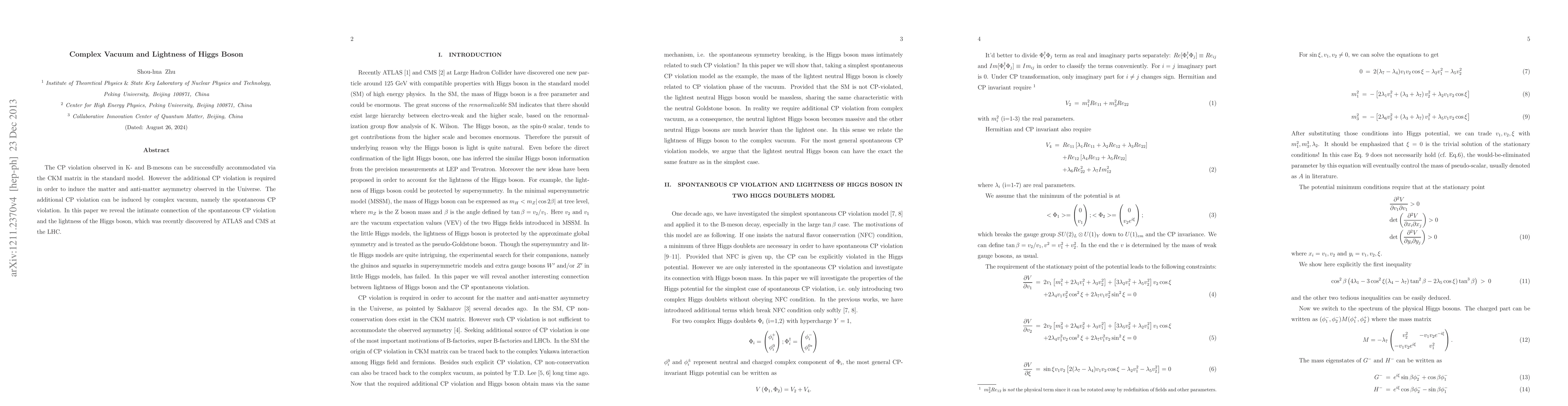 The CP violation observed in K- and B-mesons can be successfully accommodated via the CKM matrix in the standard model. However the additional CP violation is required in order to induce the matter and anti-matter asymmetry observed in the Universe. The additional CP violation can be induced by complex vacuum, namely the spontaneous CP violation. In this paper we reveal the intimate connection of the spontaneous CP violation and the lightness of the Higgs boson, which was recently discovered by ATLAS and CMS at the LHC.
