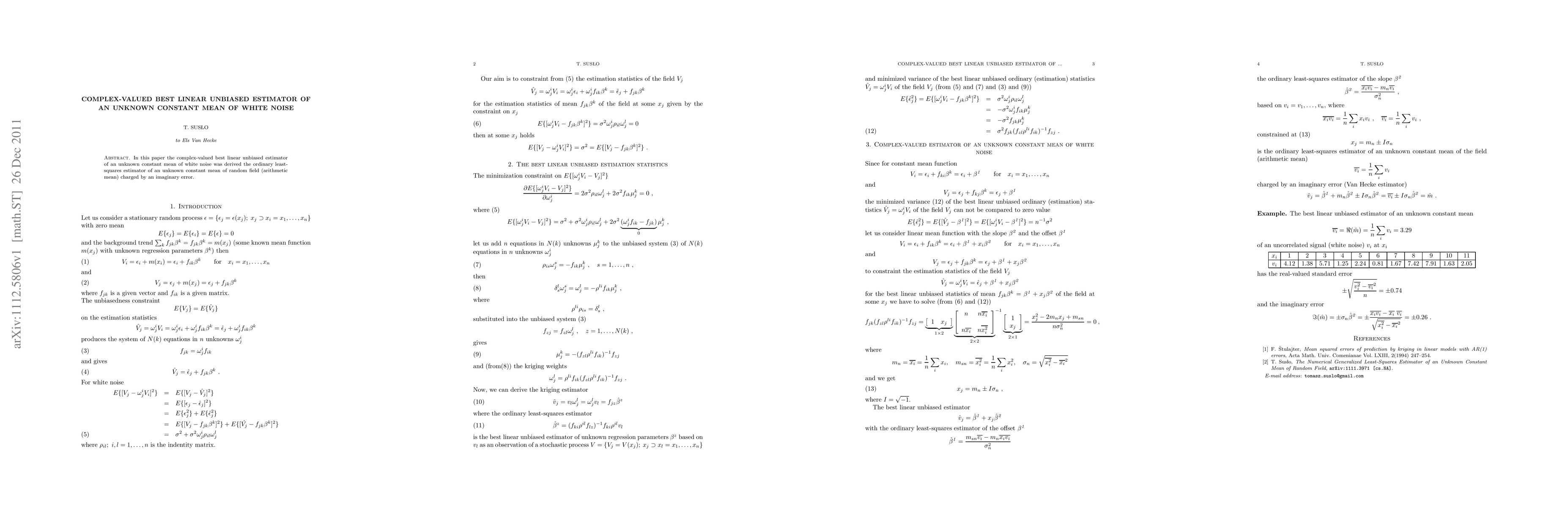 Summary: This paper derives the complex-valued best linear unbiased estimator for an unknown constant mean of white noise, contrasting it with the ordinary least-squares estimator for a random field mean affected by an imaginary error.