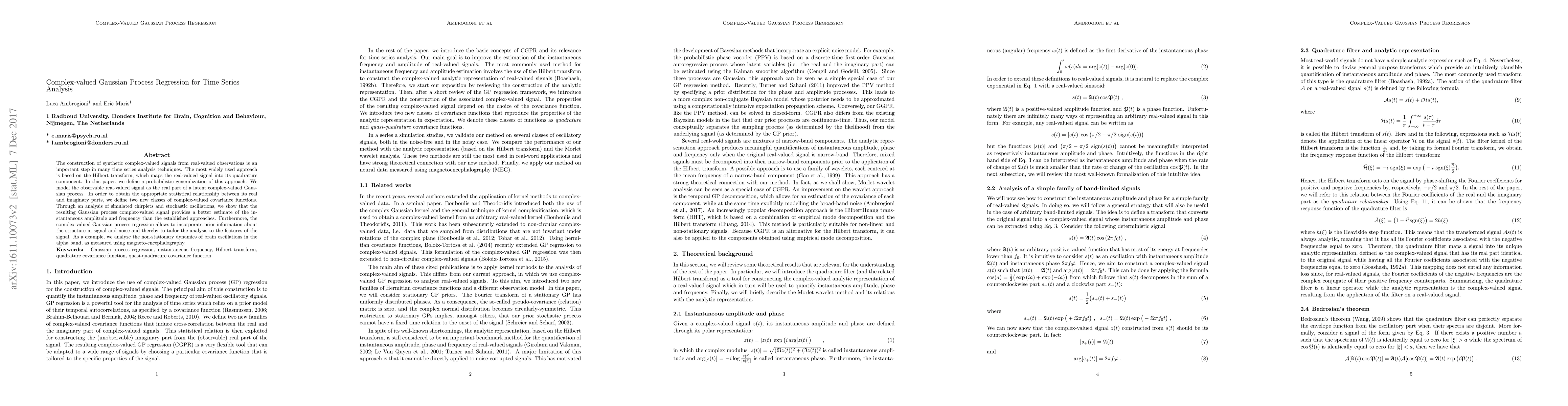 This paper introduces a complex-valued Gaussian process regression for time series analysis, modeling real-valued signals as the real part of a latent complex Gaussian process. It demonstrates improved estimates of amplitude and frequency compared to traditional methods, and showcases its application in analyzing brain oscillations.