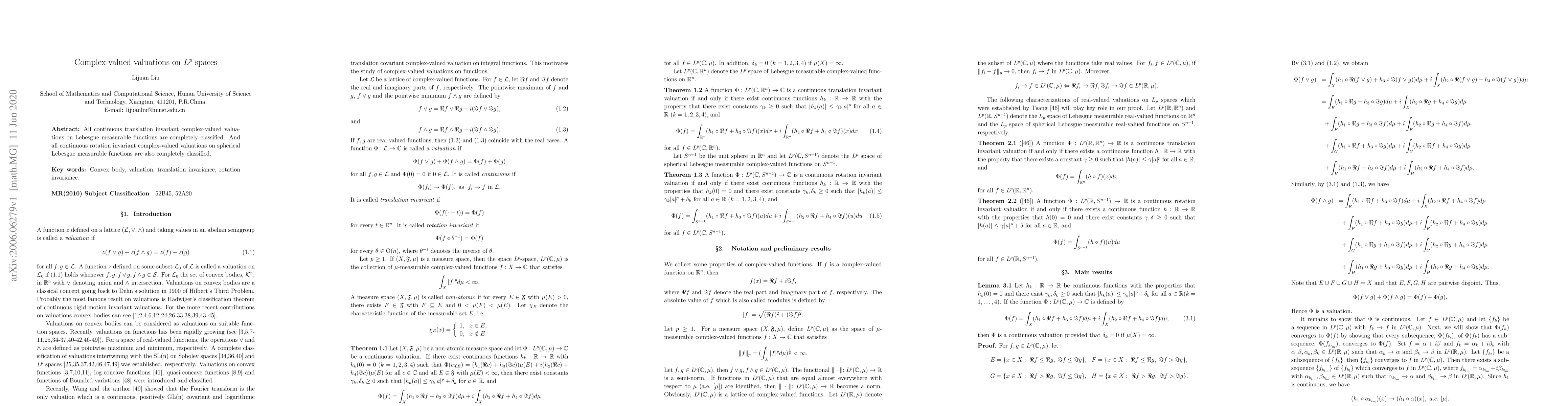 All continuous translation invariant complex-valued valuations on Lebesgue measurable functions are completely classified. And all continuous rotation invariant complex-valued valuations on spherical Lebesgue measurable functions are also completely classified.